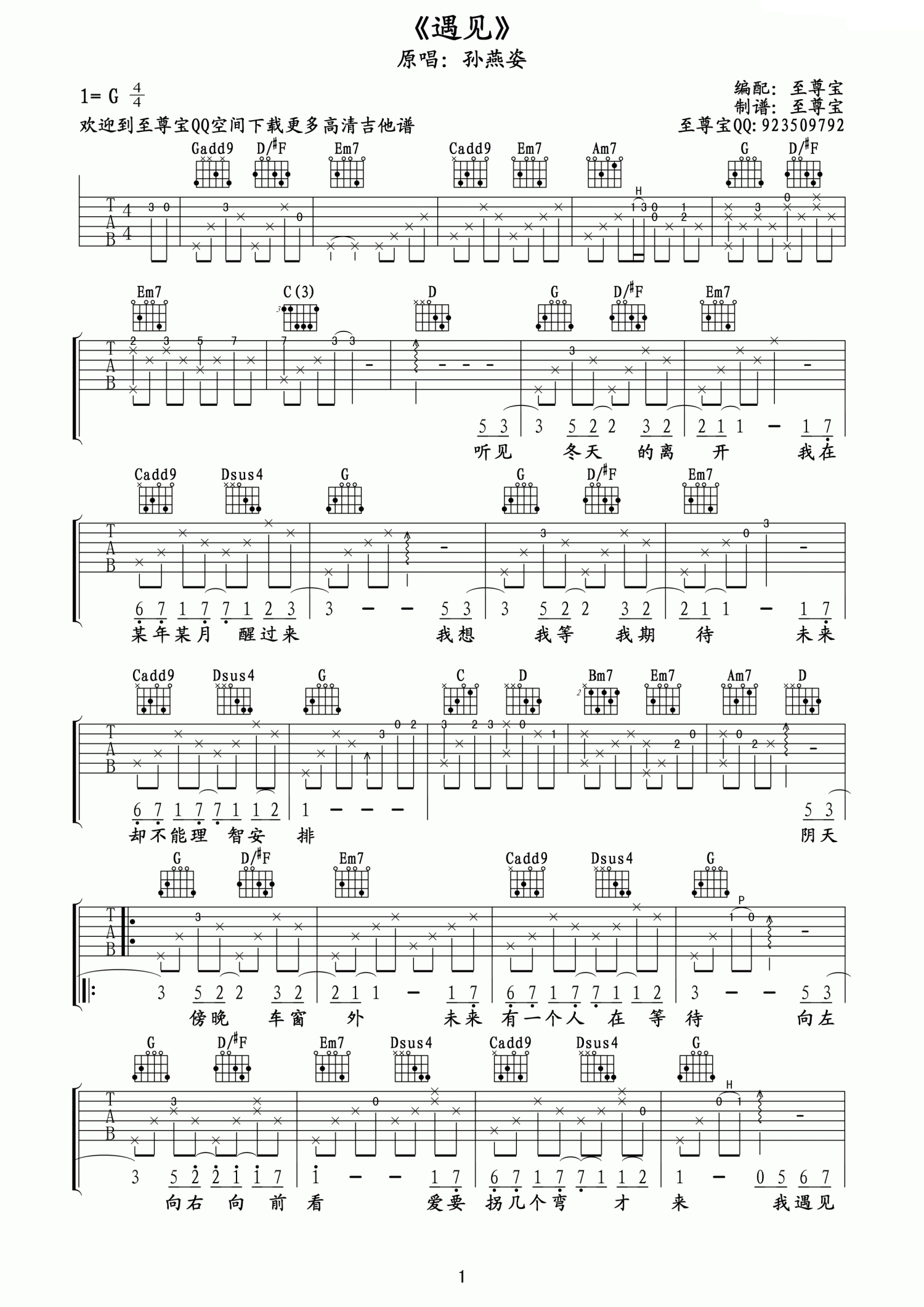曲谱介绍: 孙燕姿 遇见吉他谱 G调高清版