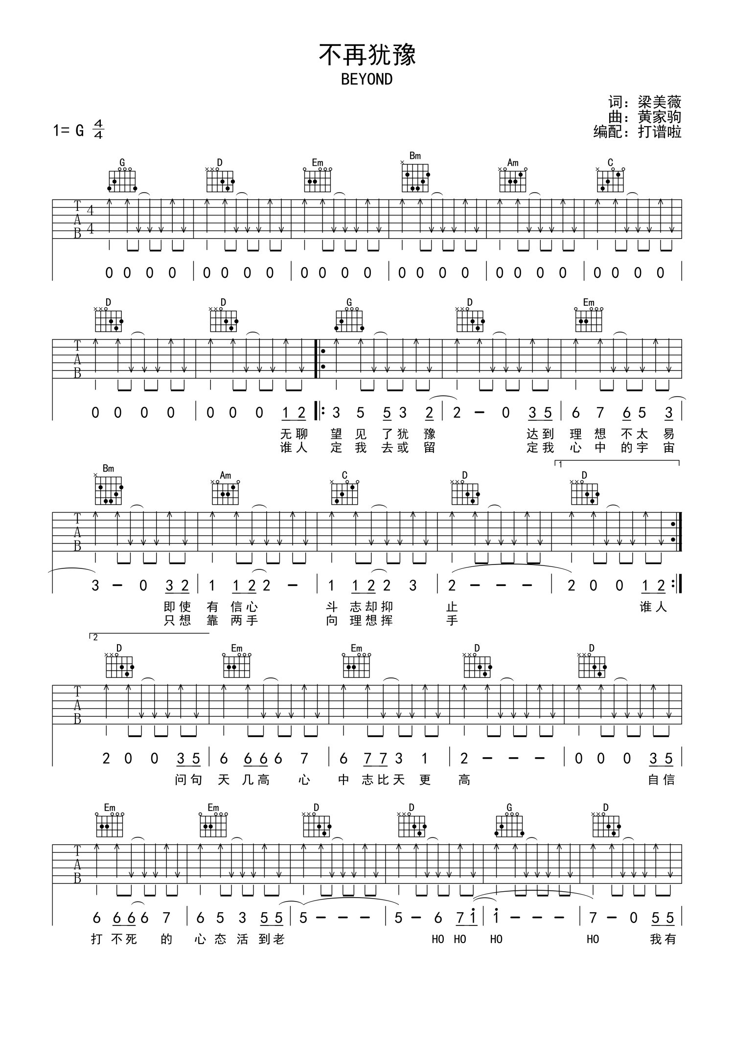 曲谱介绍: BEYOND《不再犹豫》吉他谱_G调吉他弹唱谱