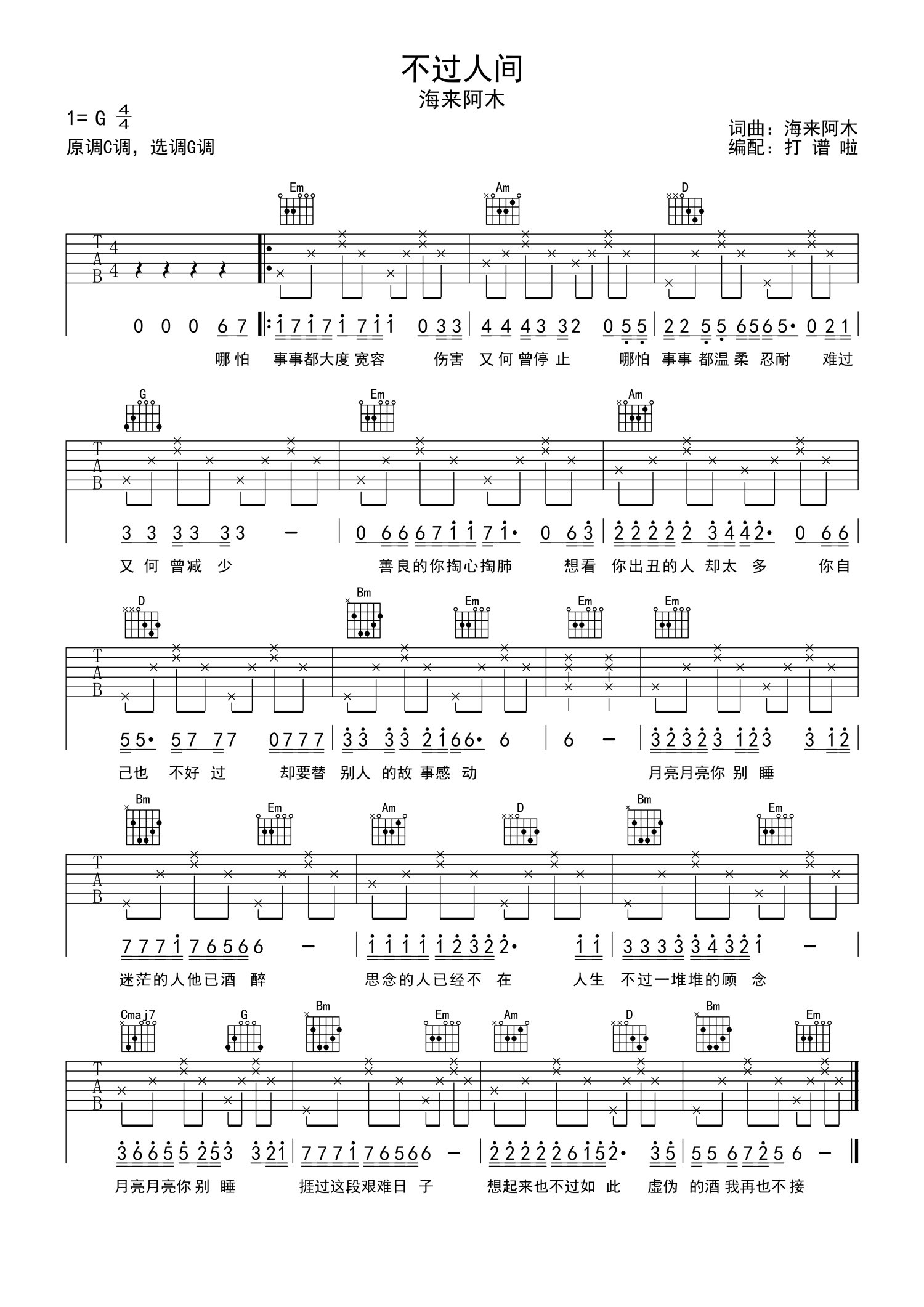 曲谱介绍: 海来阿木《不过人间》吉他谱_G调吉他弹唱谱_女生入门简单版