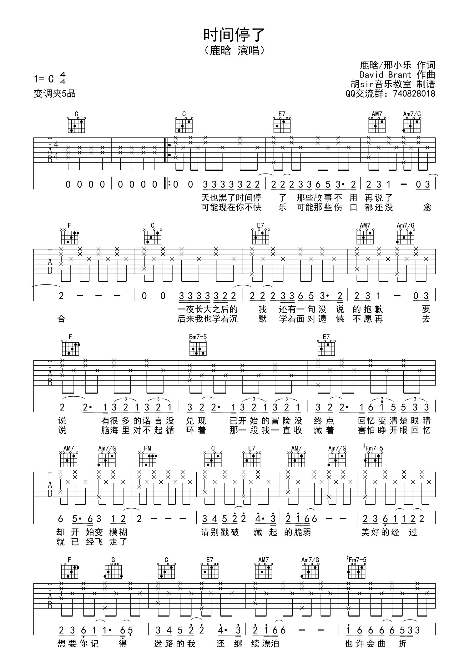 曲谱介绍: 鹿晗《时间停了》吉他谱,C的指法编配,变调夹夹五品,鹿晗新歌单曲。这是一首关于成长的歌,清澈温暖的歌声,简单真挚的唱出面对生活带来的遗憾,以及不忘初心,在迷失之中寻找自我,记住所有的美好经过。