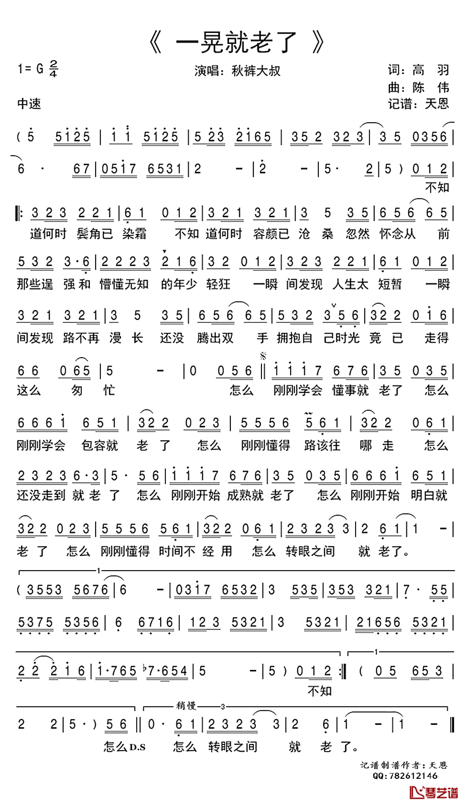 曲谱介绍: 秋裤大叔《一晃就老了》歌词_简谱