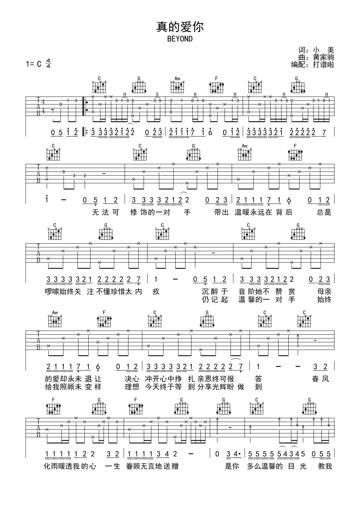曲谱介绍: Beyond《真的爱你》吉他谱_C调吉他弹唱谱