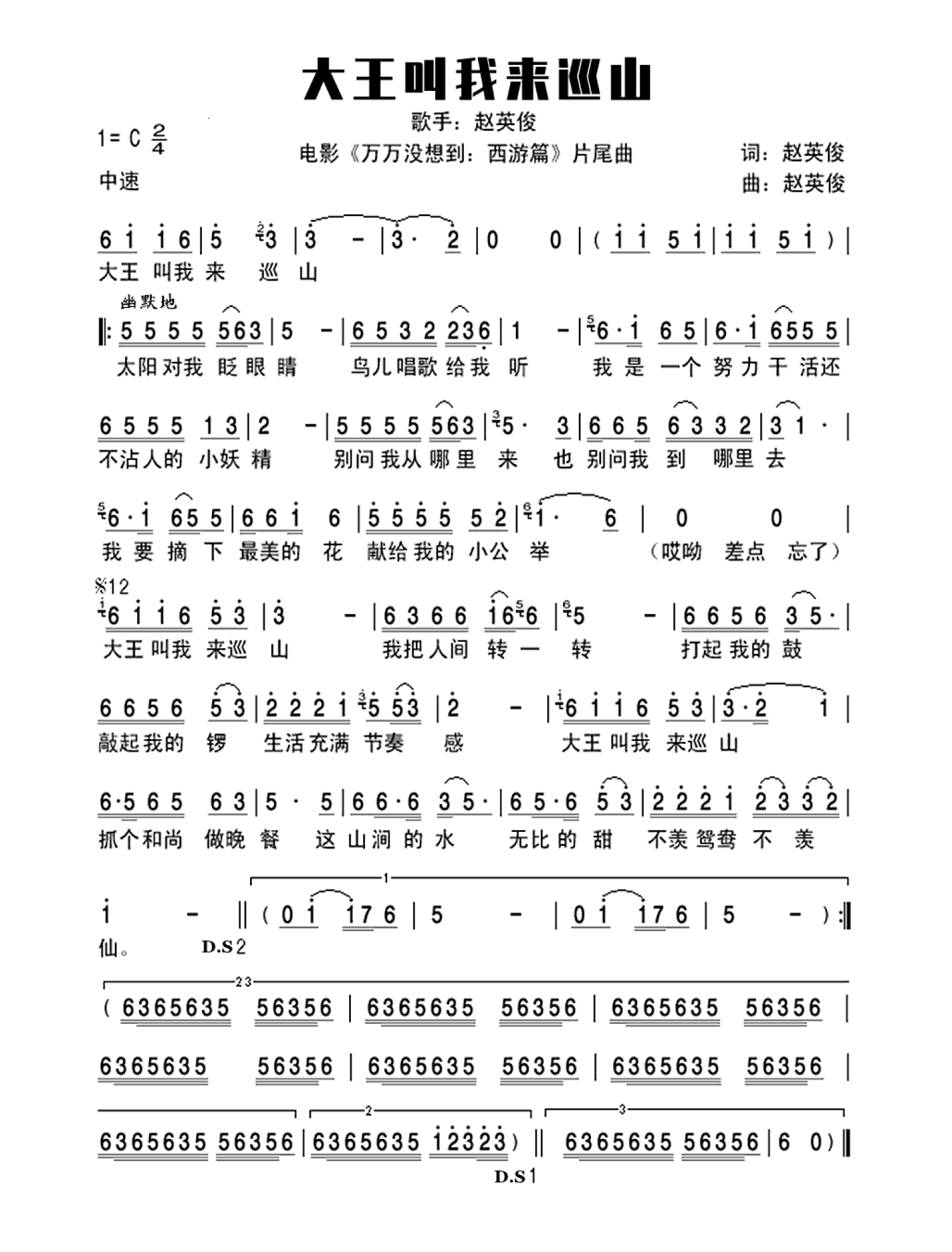 曲谱介绍: 赵英俊原唱版《大王叫我来巡山》简谱,带歌词版高清歌谱。这首歌由赵英俊原创作词、作曲,再由贾乃亮和甜馨为电影《万万没想到:西游篇》翻唱片尾曲,后被翻唱、改编出无数个版本。赵英俊《大王叫我来巡山》简谱赵英俊原名赵健,外号潇洒哥,是一位“不但当过主持人的编剧里写歌最好听的演员,还是会做电影配乐的电台DJ里唯一当过银行职员的歌手”。张靓颖形容他是“只花电费就能出歌的音乐人”。可惜天妒英才,这么年轻就早早离开了我们。或许,他原本就是天庭派来的音乐精灵:“大王叫我来巡山,我把人间转一转”。缅怀赵英俊,缅怀潇洒哥。