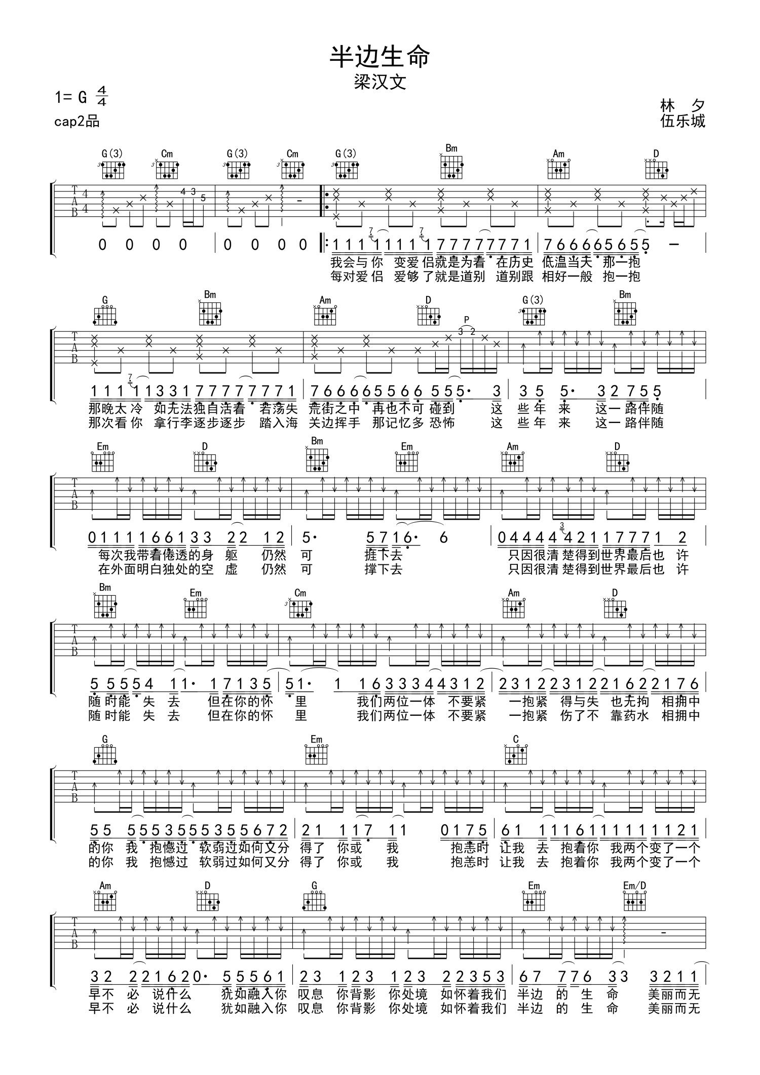 曲谱介绍: 梁汉文《半边生命》吉他谱_G调吉他弹唱谱