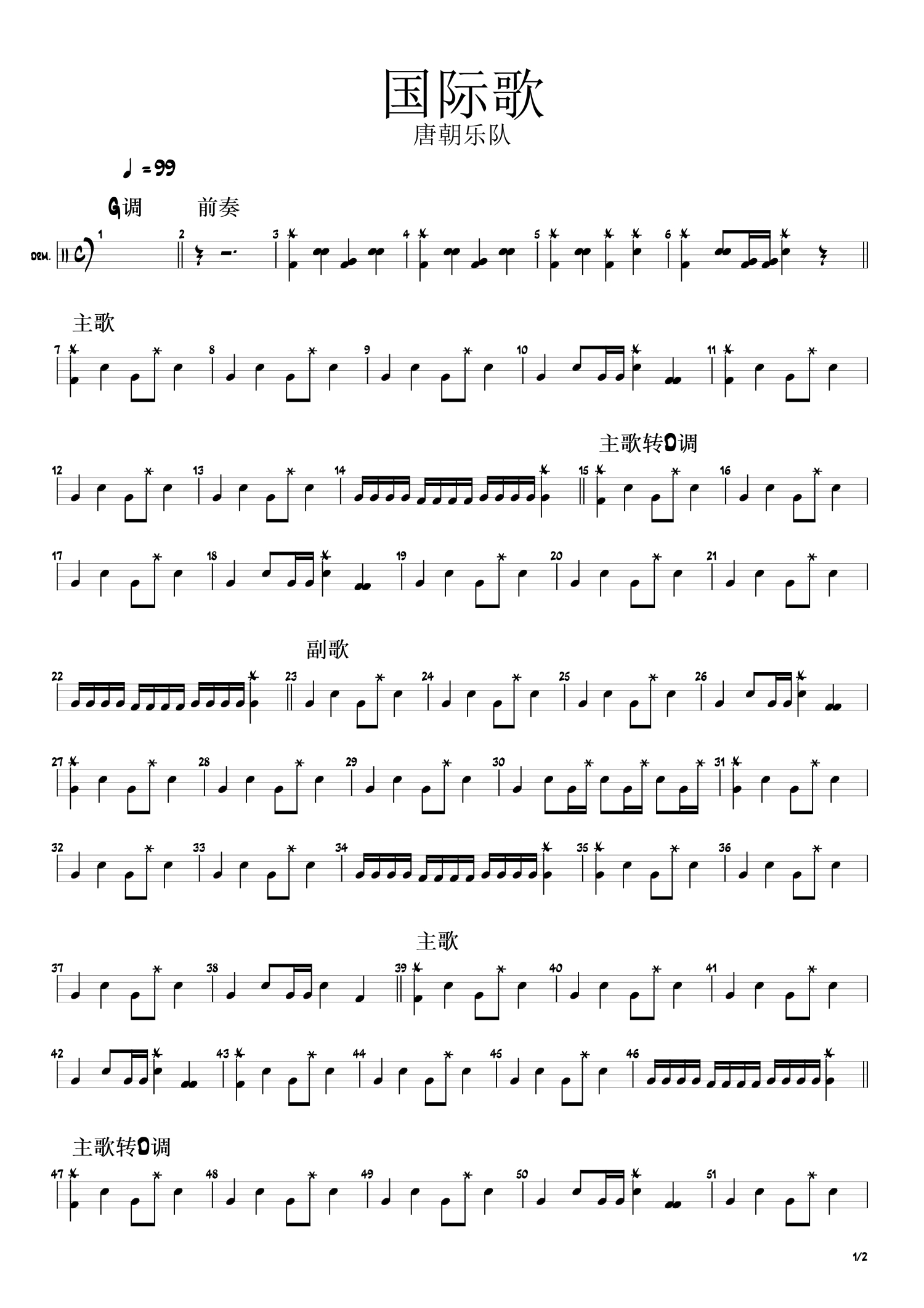 曲谱介绍: 唐朝乐队《国际歌》鼓谱_架子鼓谱