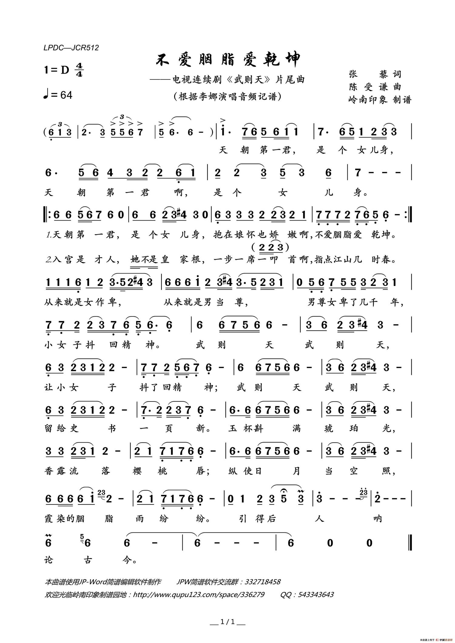 曲谱介绍: 李娜《不爱胭脂爱乾坤》歌词_简谱