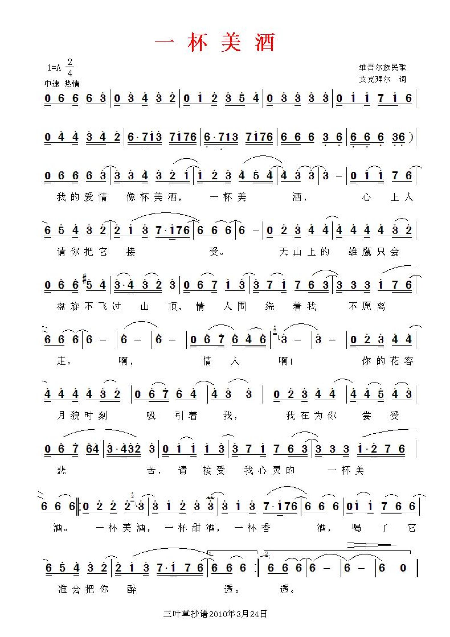 曲谱介绍: 维吾尔族民歌《一杯美酒》歌词_简谱
