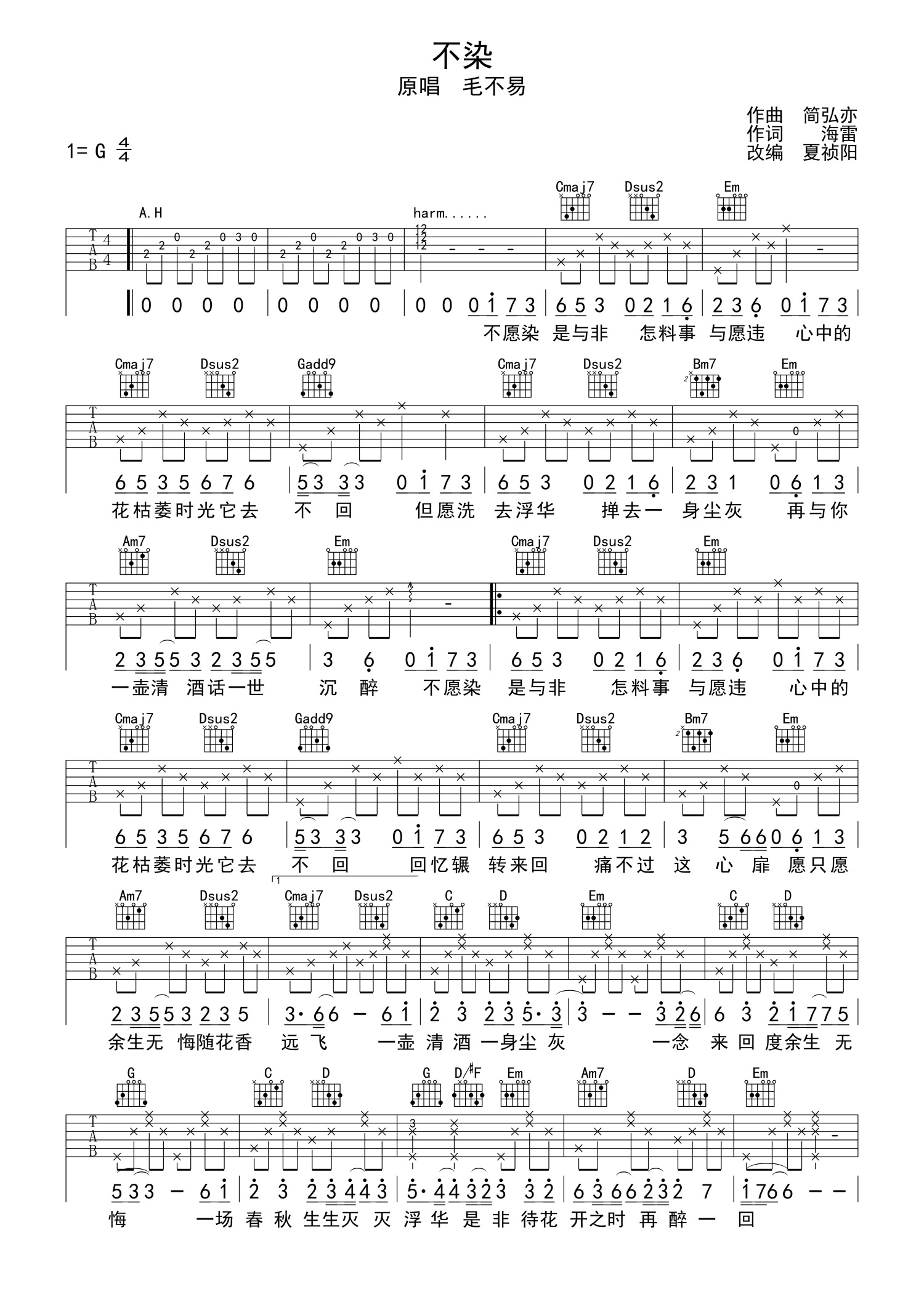 • 不染吉他谱 - 毛不易 - G调吉他弹唱谱第1张