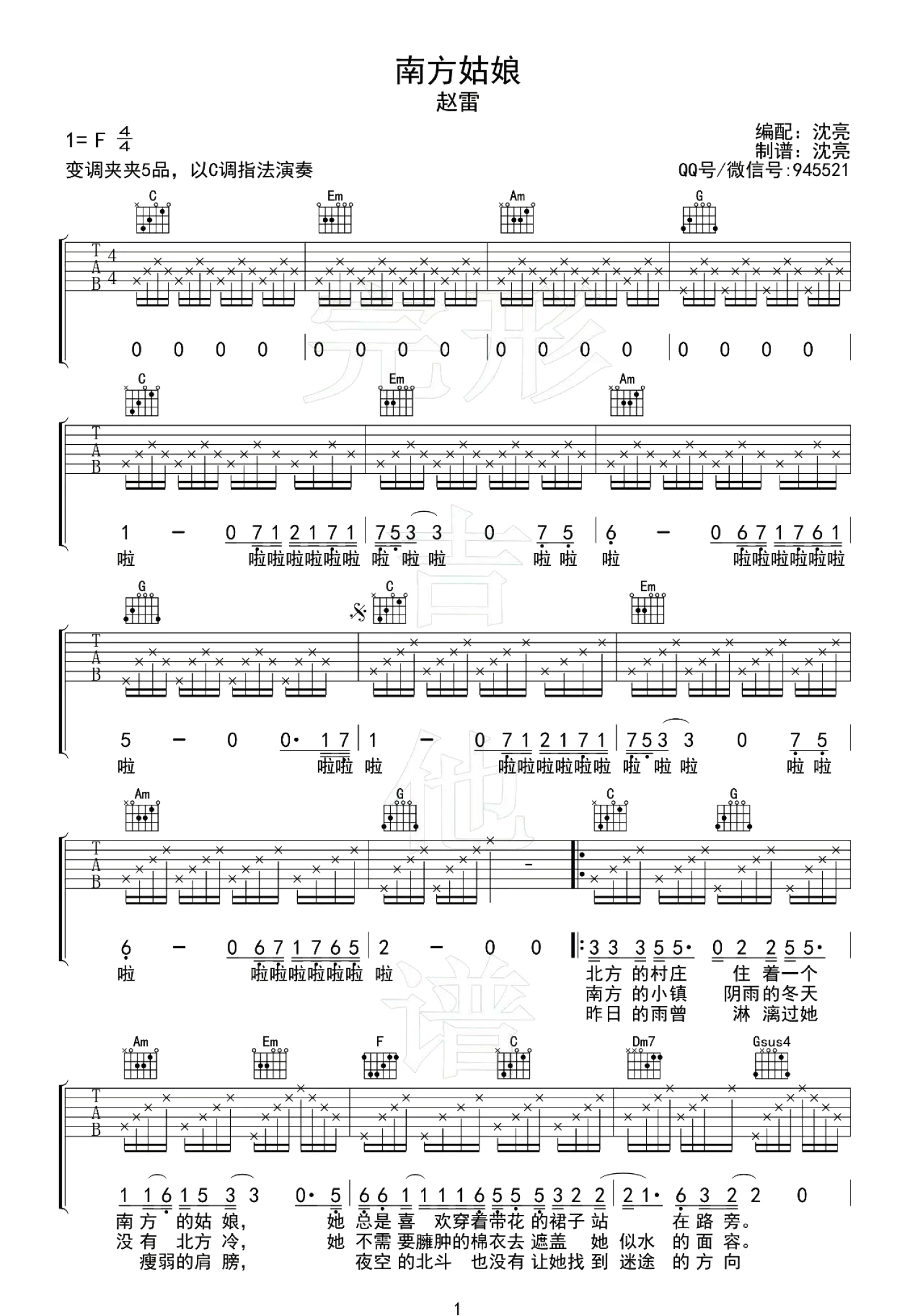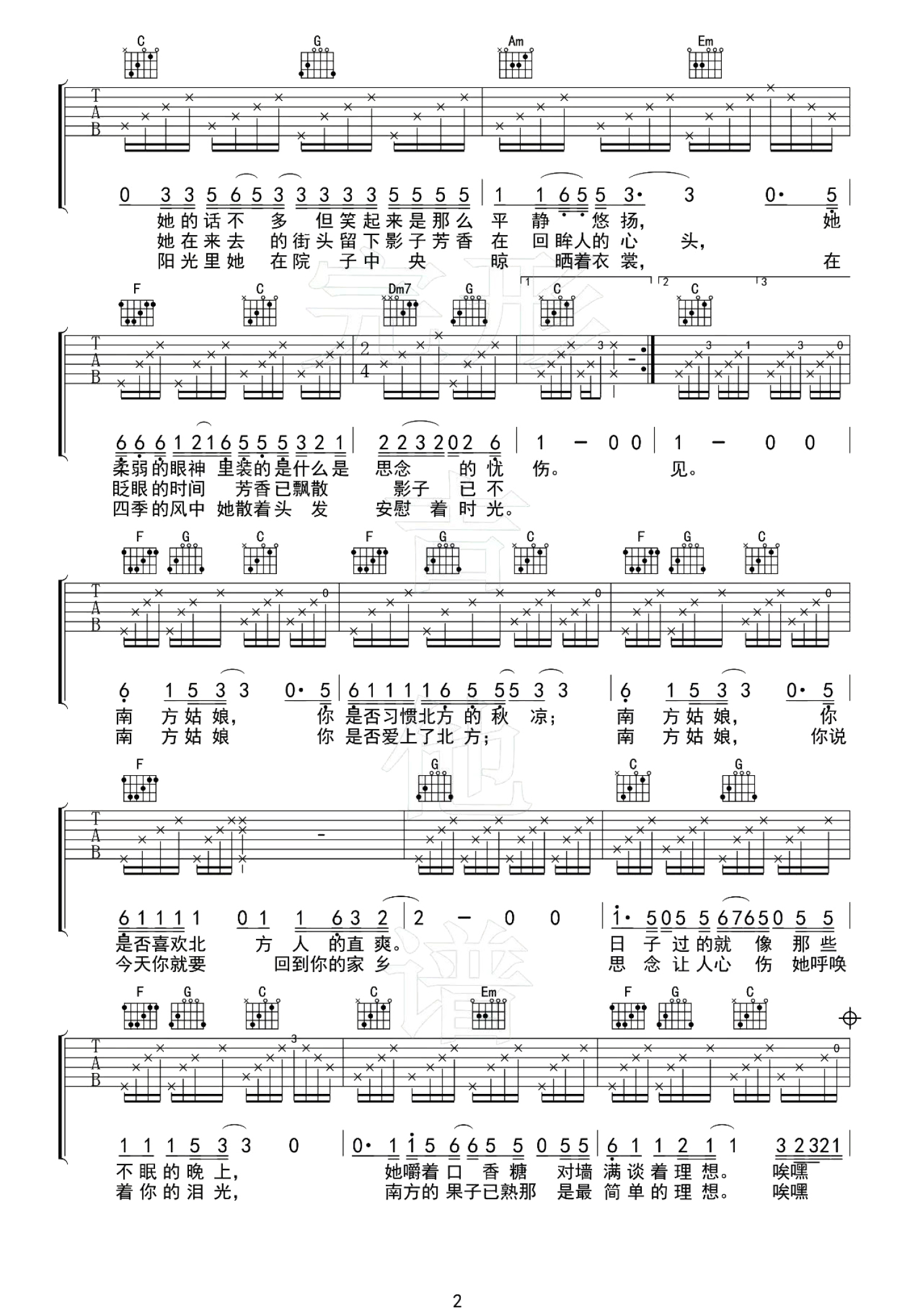 曲谱介绍: 赵雷的歌除了《成都》,还有很多动听的歌曲,比如本文分享的这首《南方姑娘》,虽然旋律简单,歌词也是淡淡的,但正是这种朴实更能真实地打动听众。《南方姑娘》吉他弹唱视频演示示范分享来自完形吉他编配《南方姑娘》吉他谱,C调版弹唱吉他谱。这首歌的主歌前半部分主要是C、Em、Am、G四个和弦的循环;后半部分是C、G、Am、Em、F、C、Dm7、G的循环;副歌是F、G、C的循环,加上两种比较基础的分解节奏型,全篇以连续16分音符的分解演奏,大家演奏要注意强弱感觉。