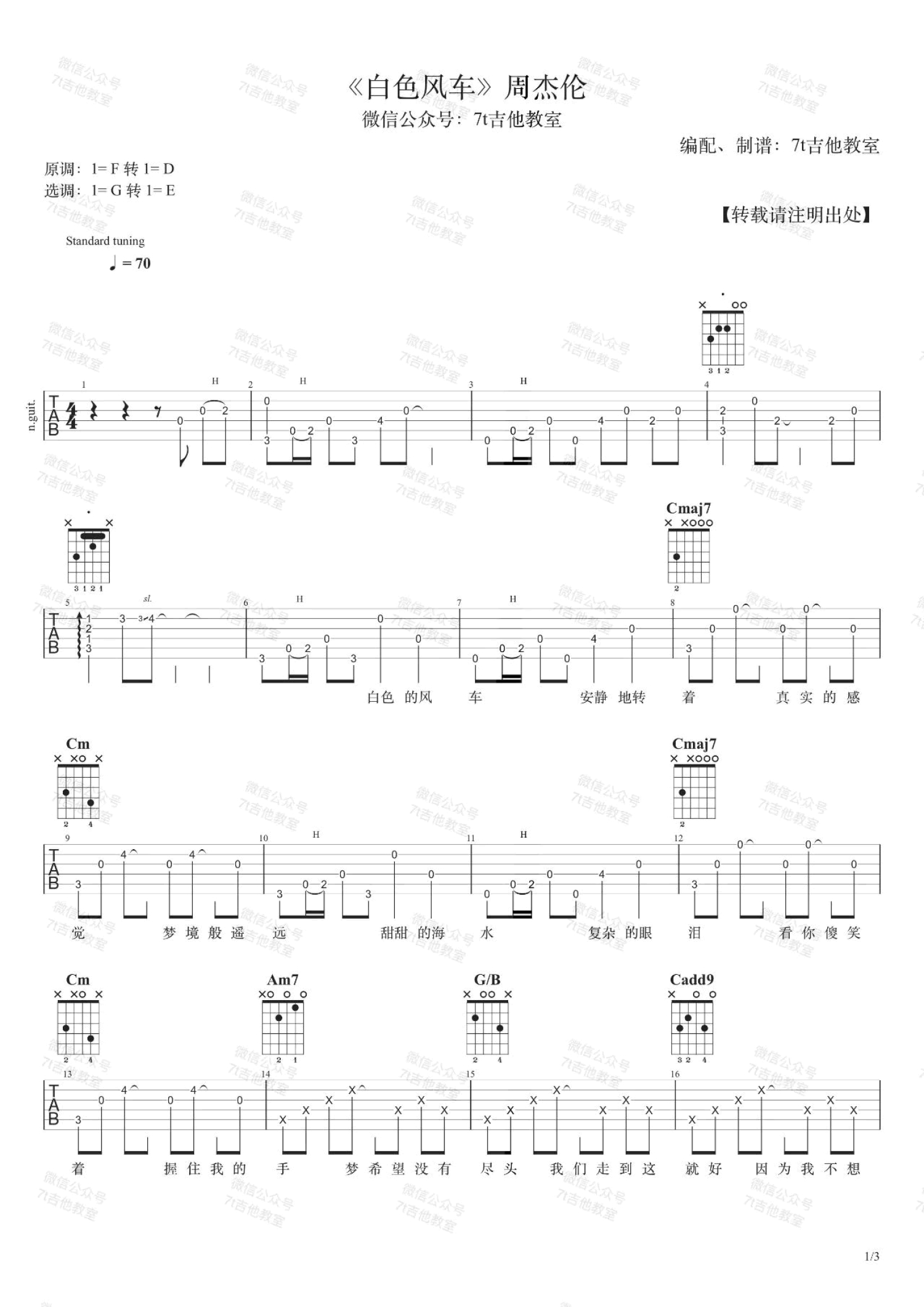 曲谱介绍: 白色风车吉他谱,周杰伦的一首歌曲,白色风车吉他六线谱,原调是F大调转D大调,这里用的是G大调转E大调的指法来编配,视频里是标准音调弦,变调夹夹在第2品。这个谱子不适合弹原调哦,因为原调需要夹太多品。 和弦分析:首先讲一下比较基本的,把一些三和弦丰富一下,二级、三级、六级大部分用了小七;四级用了add9或maj7;五级用了sus4……主歌部分用了四级小和弦Cm,这里的4→4m是比较常见的用法。「梦希望没有尽头,我们走到这就好……」这一句Am7→G/B→Cadd9也是很常见的斜杠和弦用法。这首歌比较特别的是主歌和副歌是不同的调,也就是转调,谱子里G调主歌进入E调副歌之前用了E调的属七和弦B7,一般转调或者离调,几乎都会用到“属和弦→主和弦“这样的进行。「我不懂你说什么……」这里的二级F#7用了属七,可以理解为副属和弦。