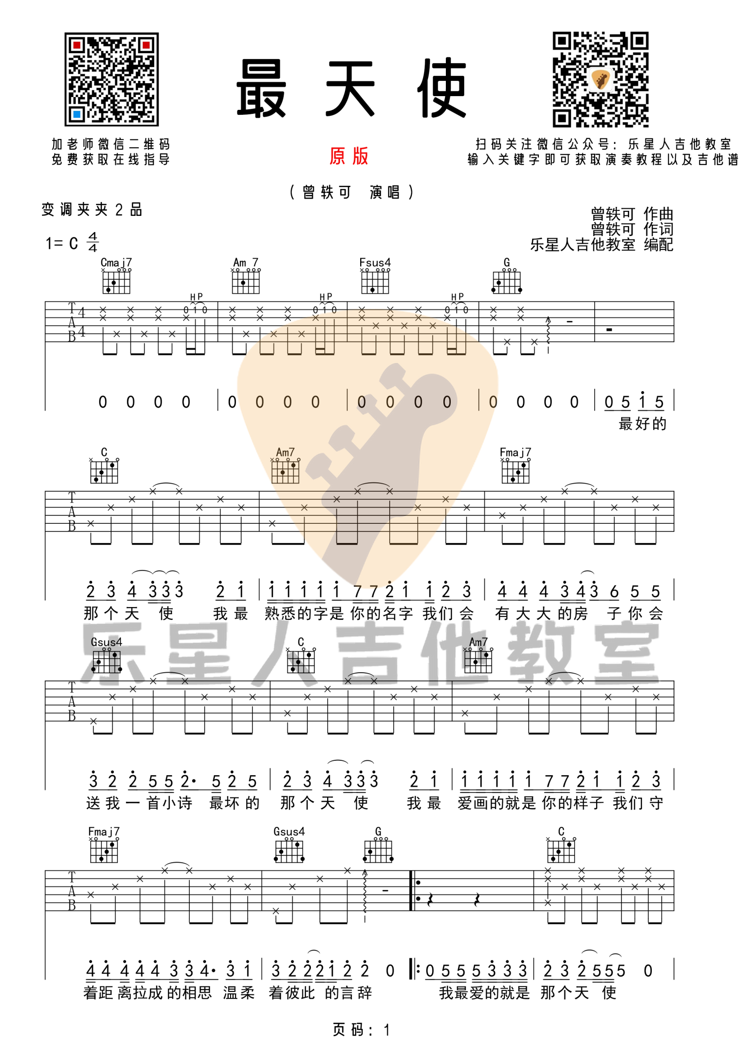 曲谱介绍: 曾轶可《最天使》,这首09年的歌曲最近在网络爆红,歌曲以舒缓吉他旋律为基调,配上略带伤感的歌词,深受吉他爱好者的喜爱。我们会有大大的房子,你会送我一首小诗,我想这是这首歌最吸睛的地方之一,这种精神层面的浪漫,远胜于一束娇艳的玫瑰。爱她,就送她一首小诗,在阳光下,在风中,拥抱彼此,成为彼此最好的天使,C调原版和弦编配,难度一般,演奏建议变调夹夹第二品。