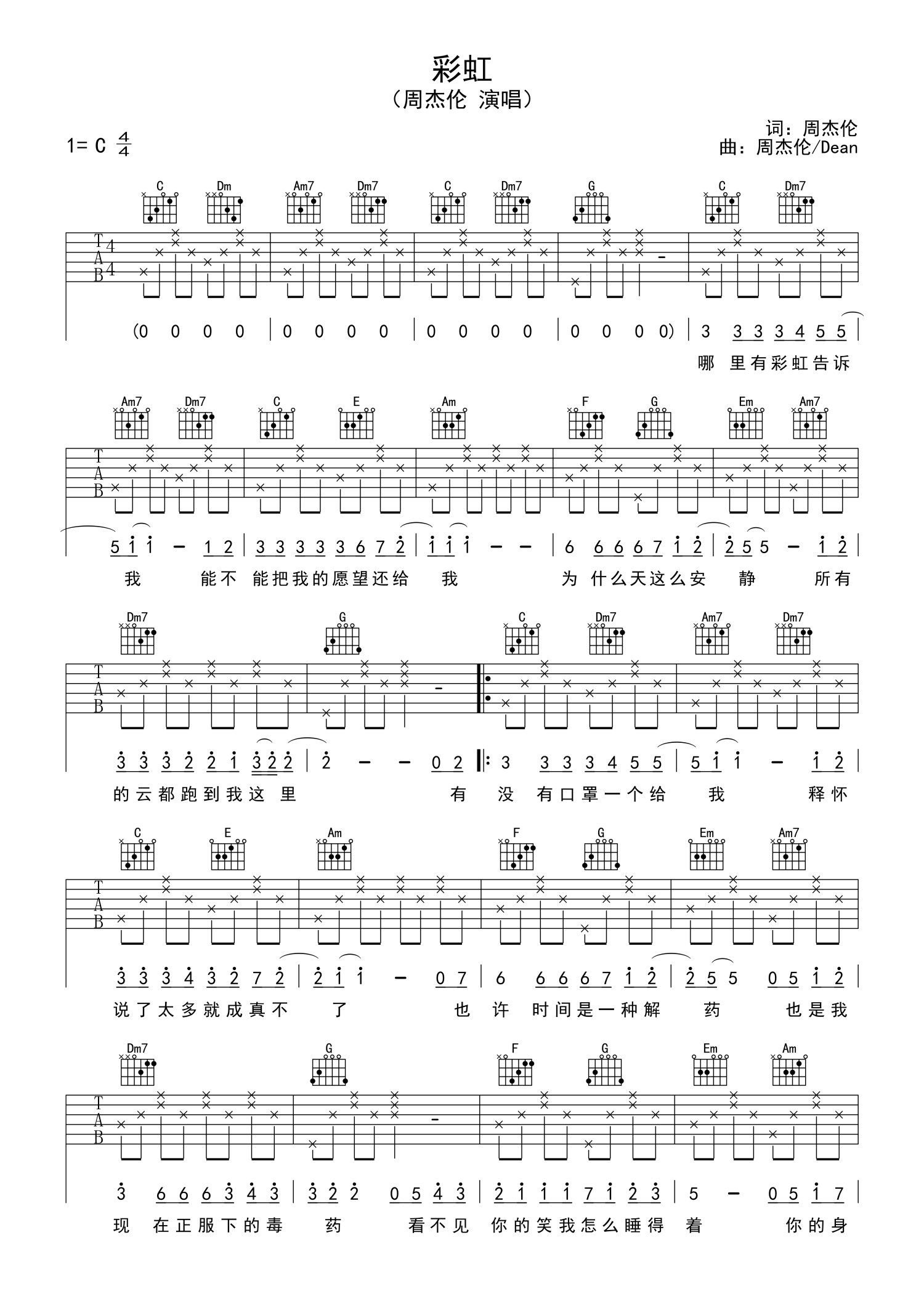 曲谱介绍: 周杰伦《彩虹》吉他谱_C调吉他弹唱谱_简单入门版