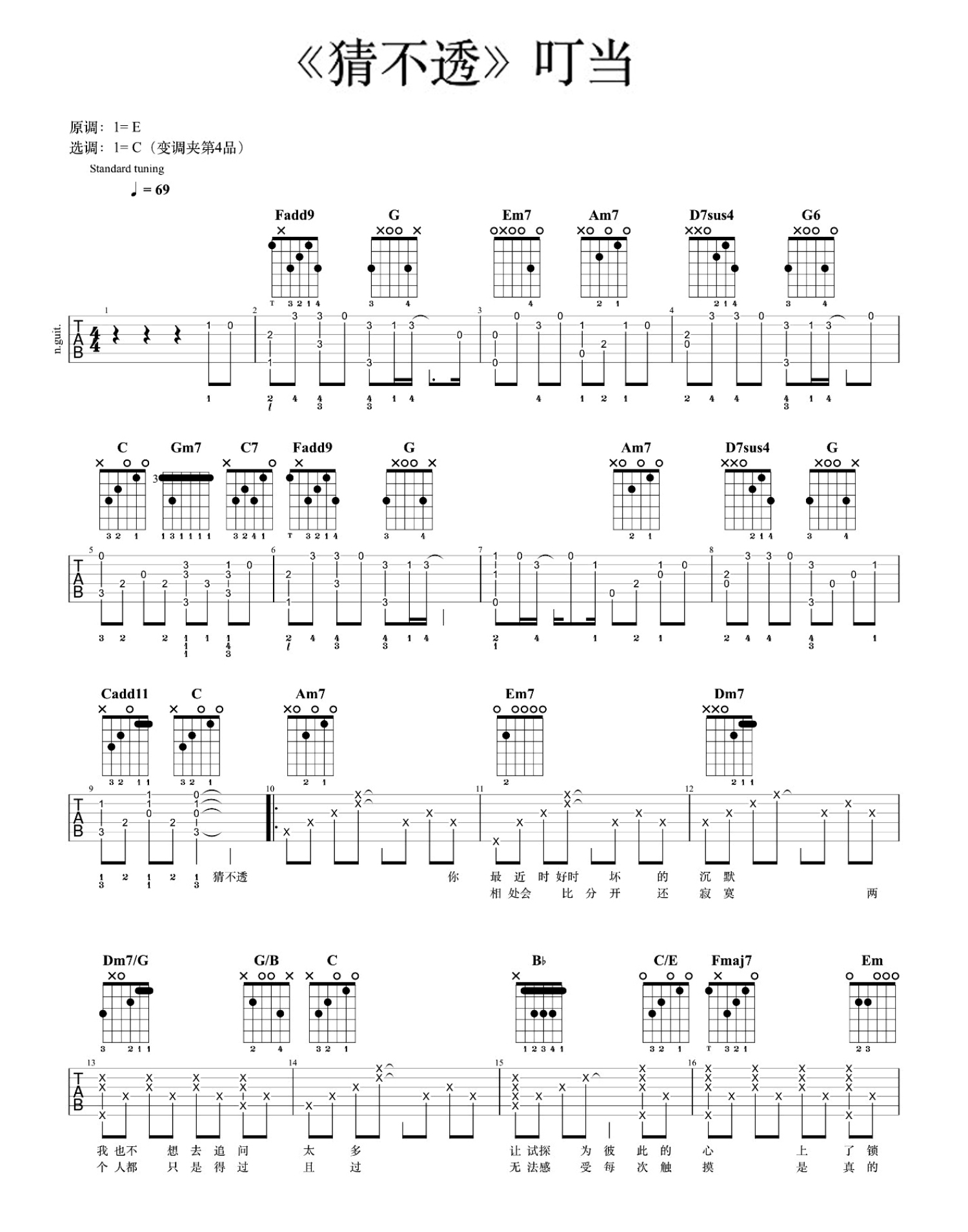 曲谱介绍: 猜不透吉他谱,丁当演唱的一首情歌,猜不透吉他弹唱谱,选调C,变调夹夹第四品。老师编配说明,这首歌的原调是E大调,是改编为一个C调版本的完整谱子,难度会有所降低哦!(前奏还是有点难)谱子里我所用的Fmaj7和弦的按法对新手会有点难,可以根据自己的情况,改成较为简单的Fmaj7和弦或者小横按的F和弦(根音在第4弦那种)。《猜不透》吉他弹唱示范演示视频。