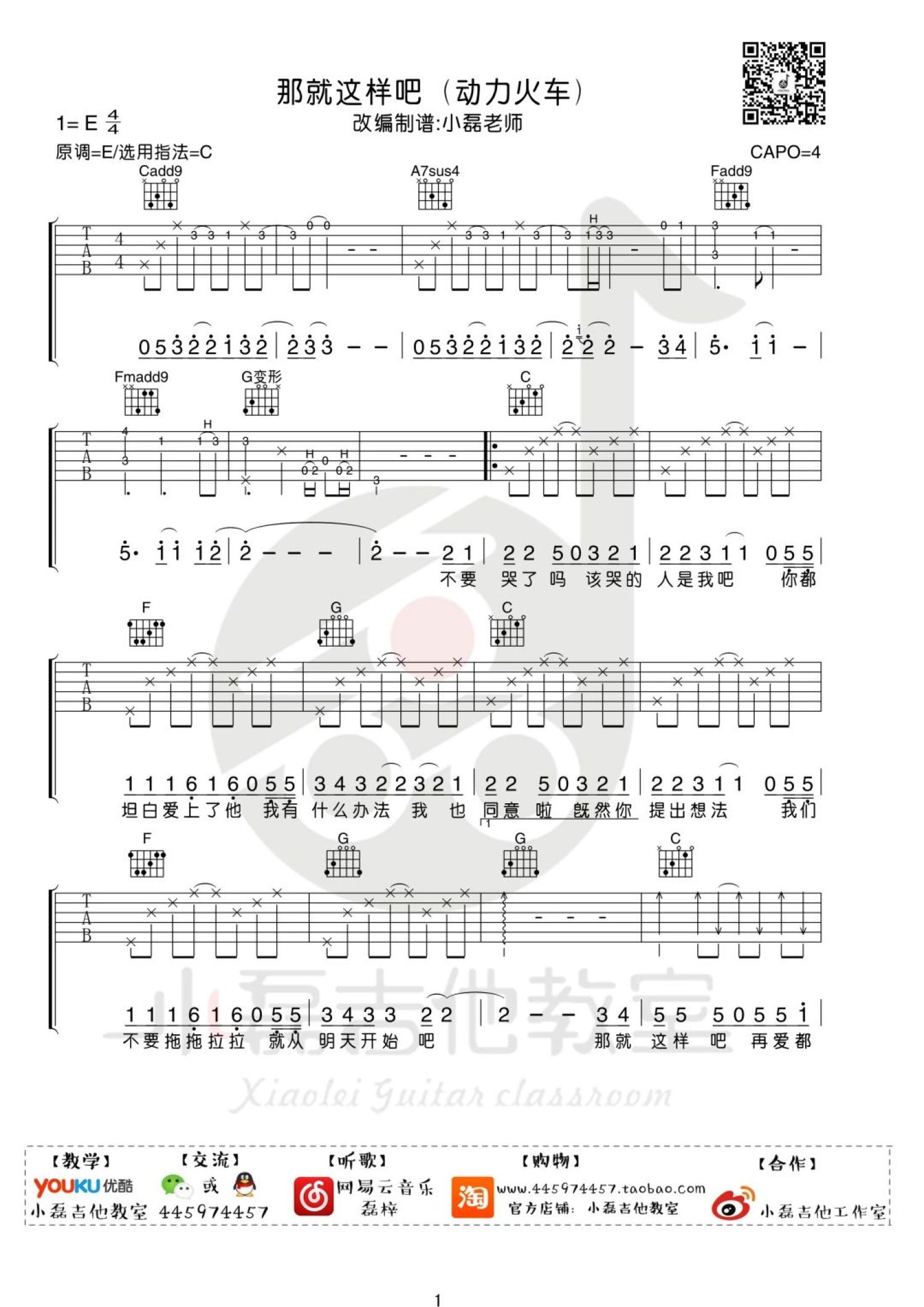 曲谱介绍: 动力火车《那就这样吧》,一首比较老的歌,律动感挺强烈,那就这样吧,透着一些无奈,还有些许勉强。有时候为什么我们会觉得心累,应该就是常常徘徊在坚持和放弃之间,举棋不定。既然回不了头,也不必不忘却,攒够失望就离开吧,总不能再攒够绝望。《那就这样吧》吉他弹唱视频教学分享小磊吉他教室编配《那就这样吧》吉他谱,附弹唱视频教学,非常细致的教程,喜欢的朋友来试试吧。歌曲的整体难度不高,前奏,主歌,副歌都区分的很清晰,后段加入了拍弦的技巧,增加律动性,也是现在大多数同学很喜欢的编排!
