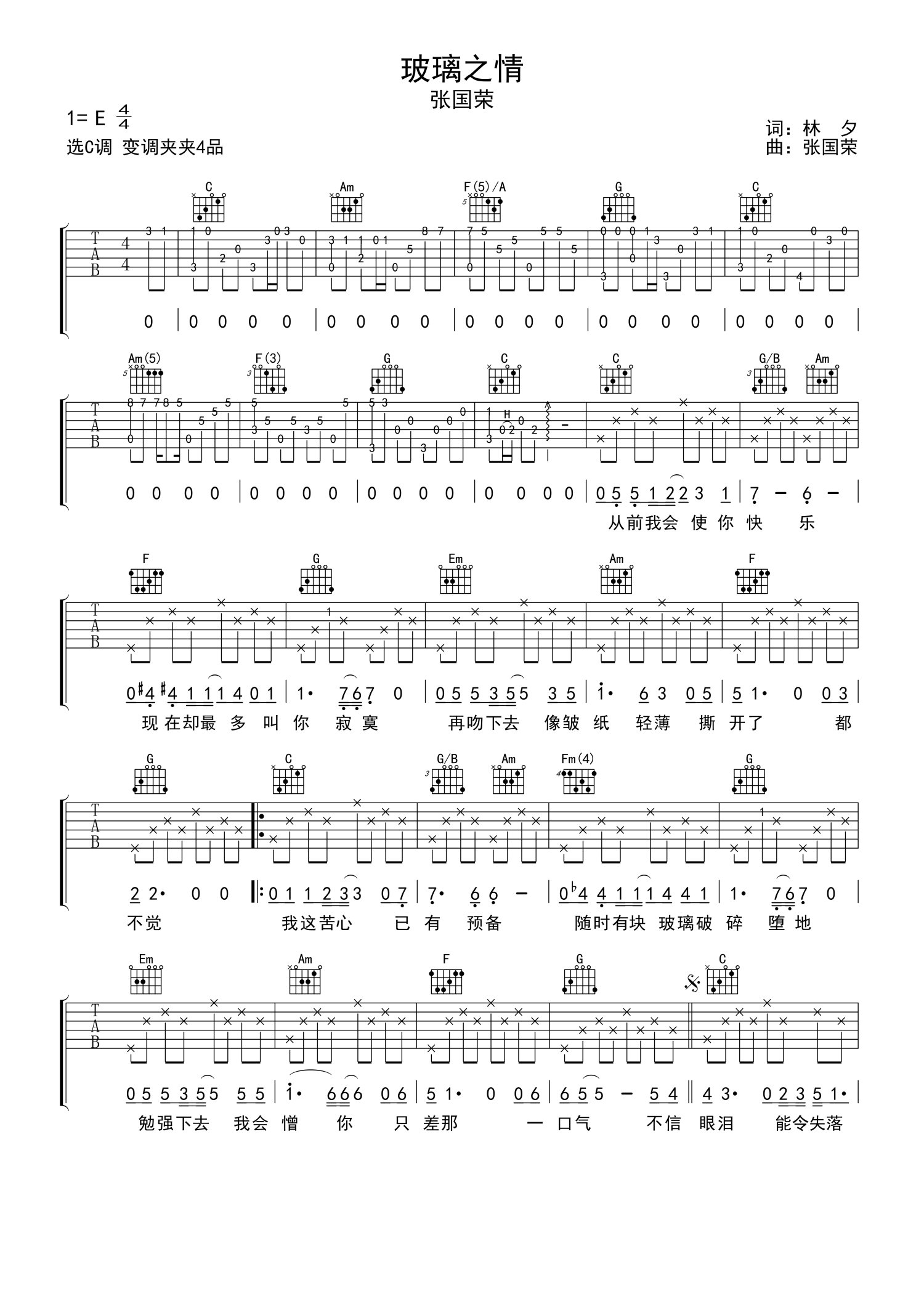 曲谱介绍: 张国荣《玻璃之情》吉他谱_C调吉他弹唱谱