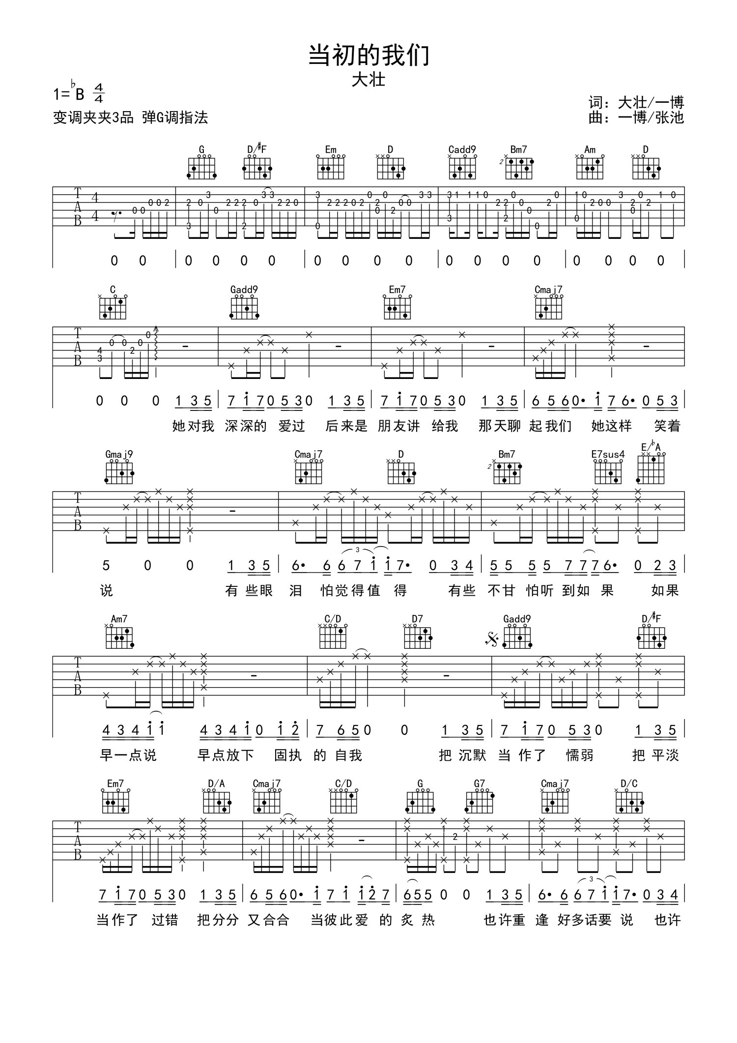 曲谱介绍: 大壮《当初的我们》吉他谱_G调吉他弹唱谱
