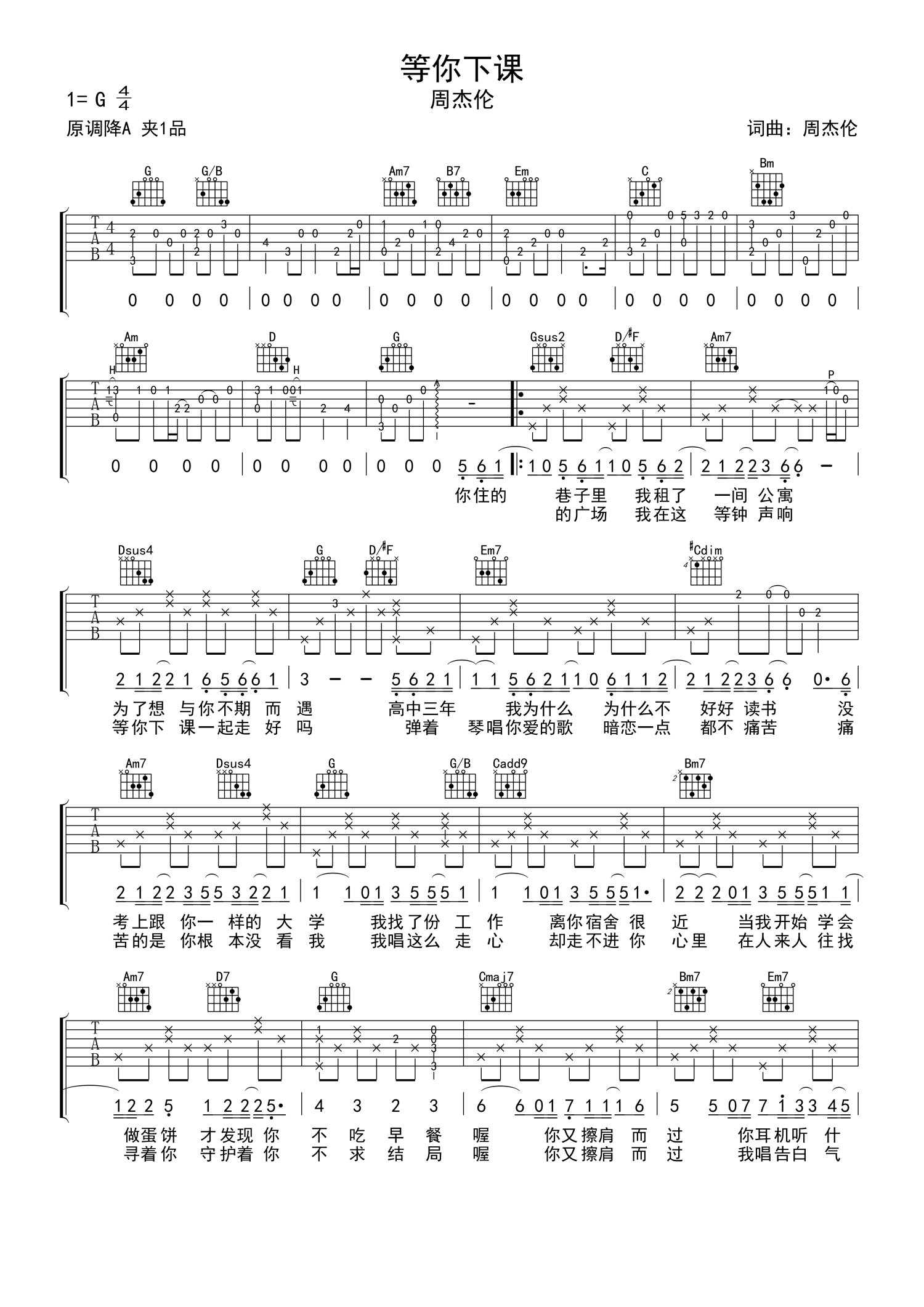 等你下课吉他谱 - 周杰伦 - G调吉他弹唱谱