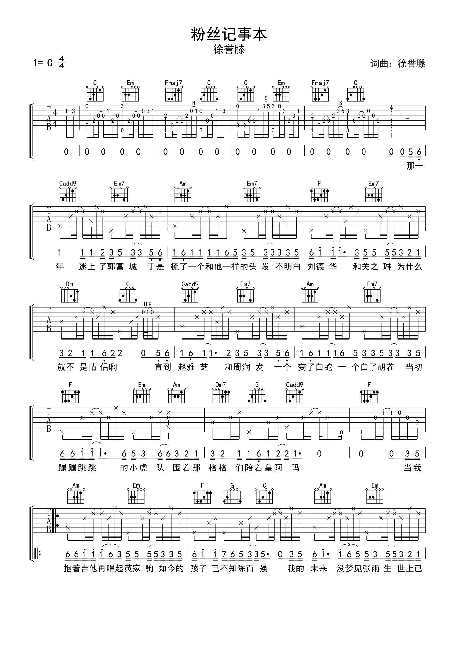 曲谱介绍: 徐誉滕《粉丝记事本》吉他谱_C调吉他弹唱谱