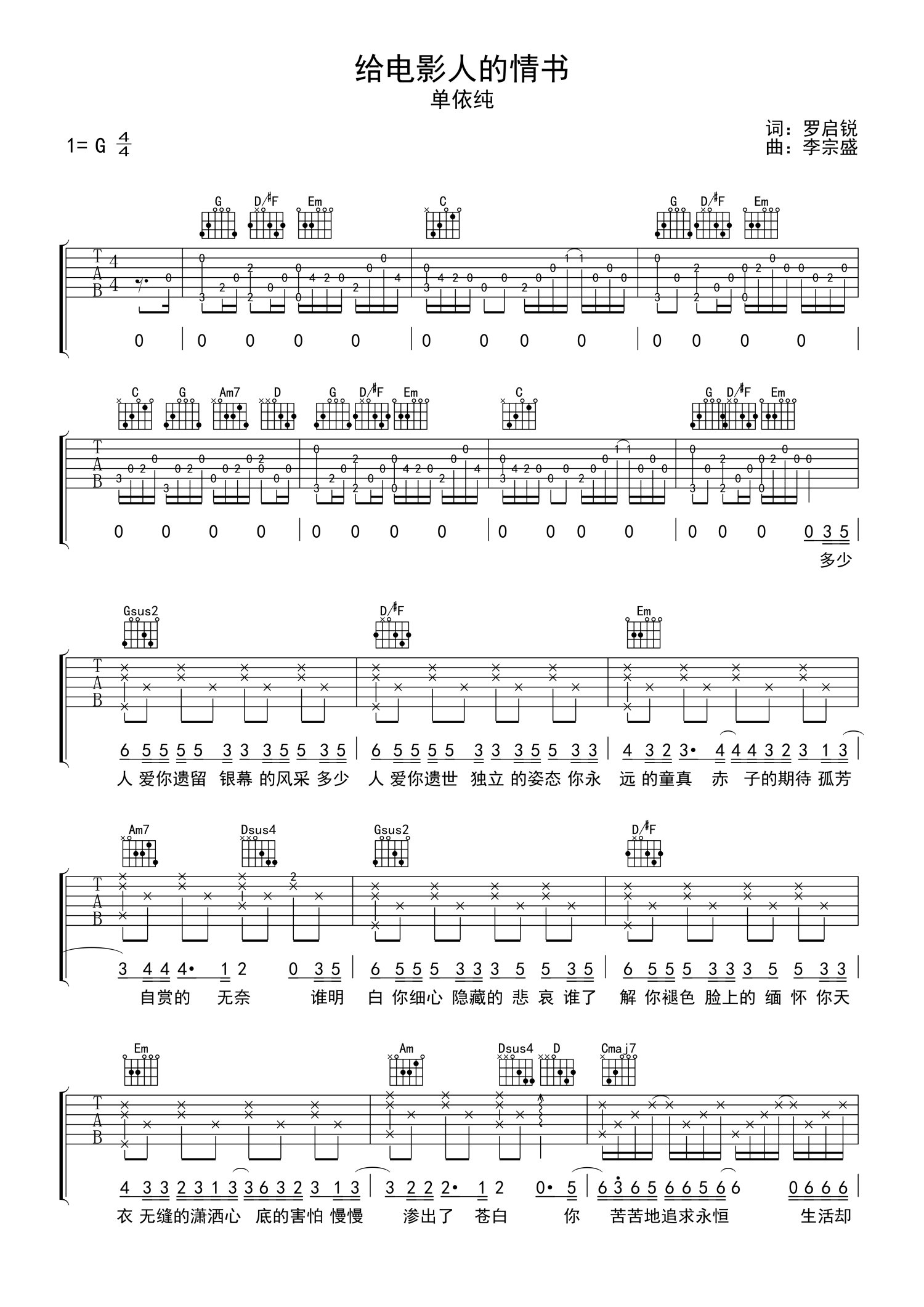 曲谱介绍: 单依纯《给电影人的情书》吉他谱_G调吉他弹唱谱