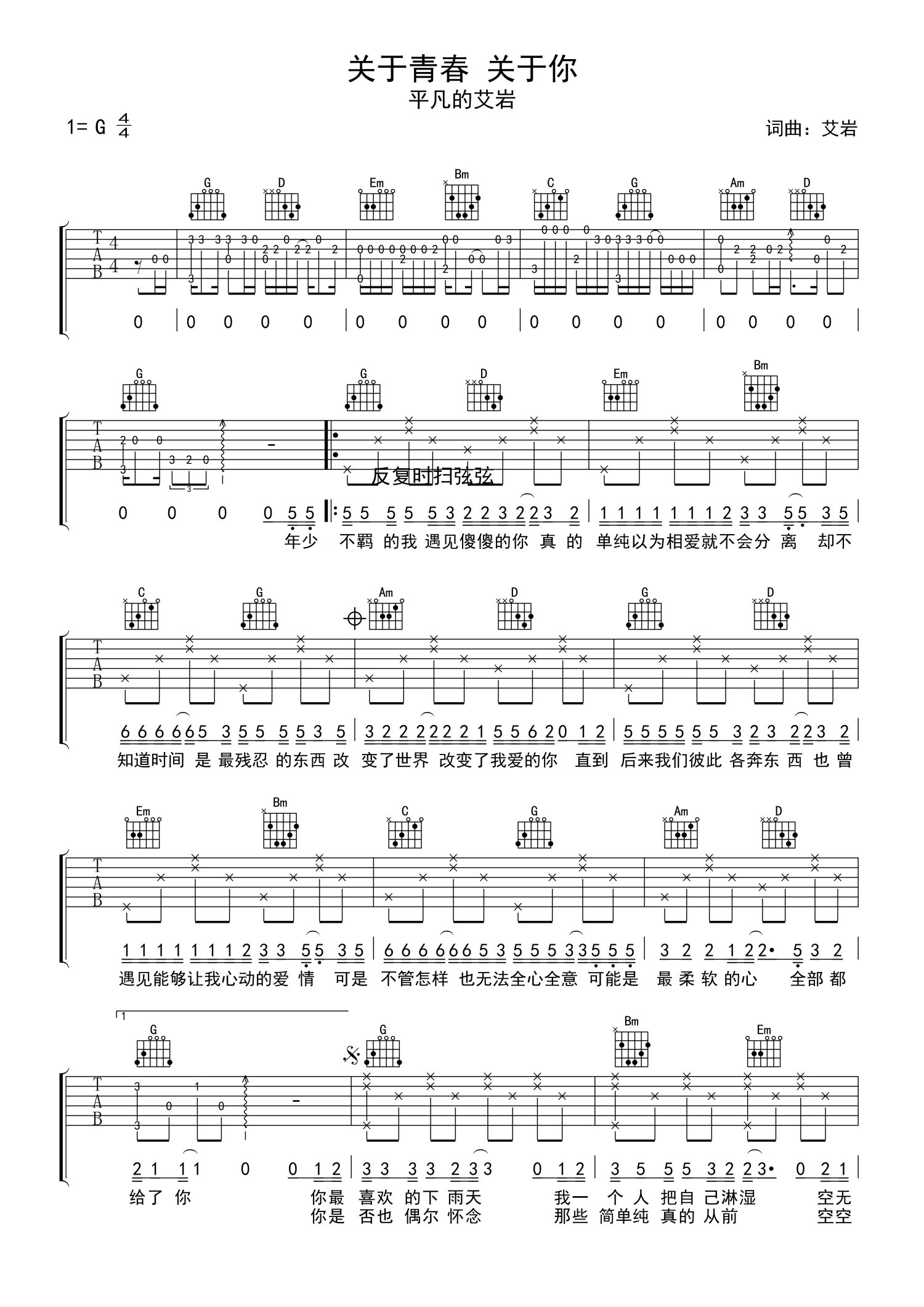 曲谱介绍: 平凡的艾岩《关于青春关于你》吉他谱_G调吉他弹唱谱