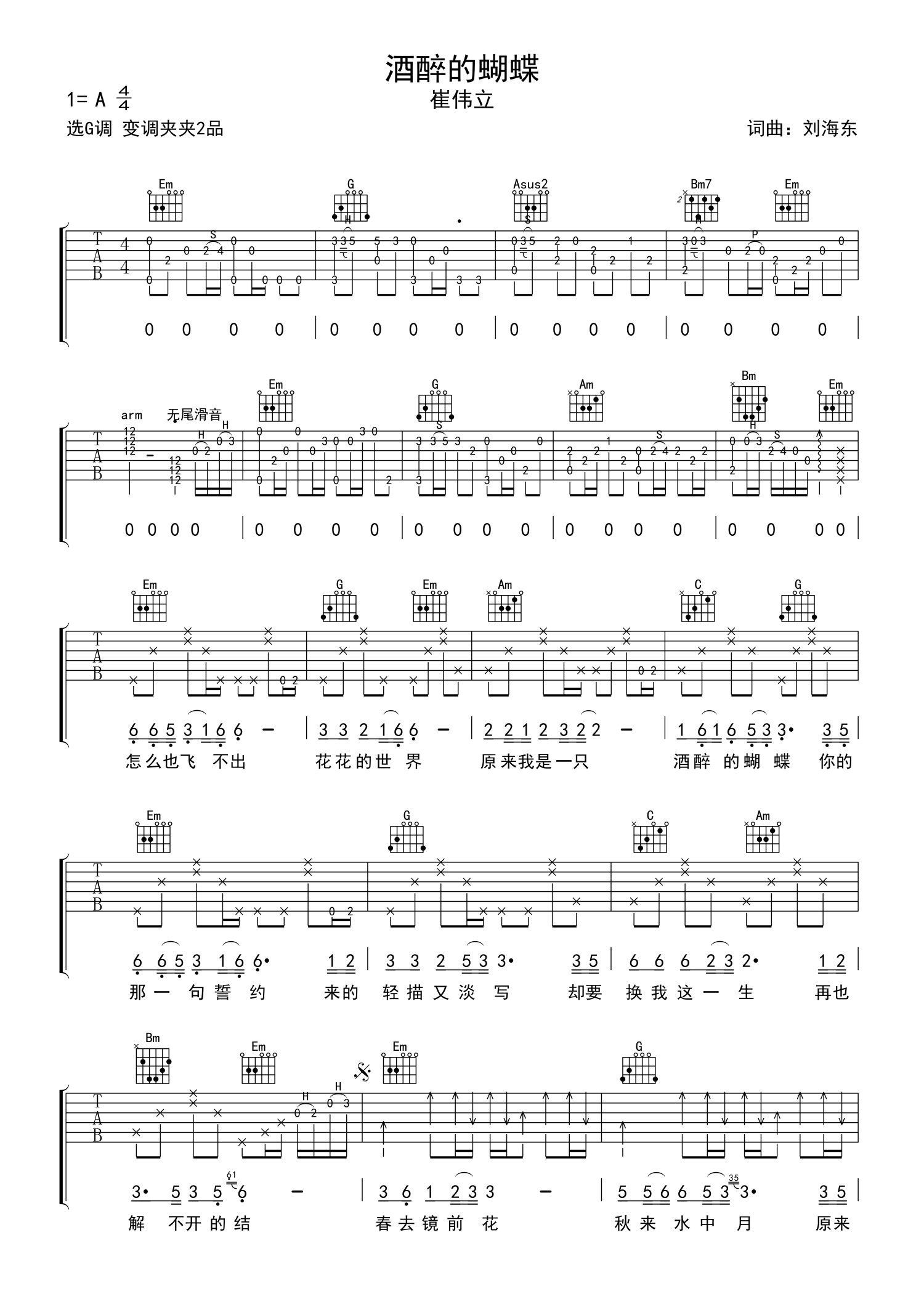 曲谱介绍: 崔伟立《酒醉的蝴蝶》吉他谱_G调吉他弹唱谱