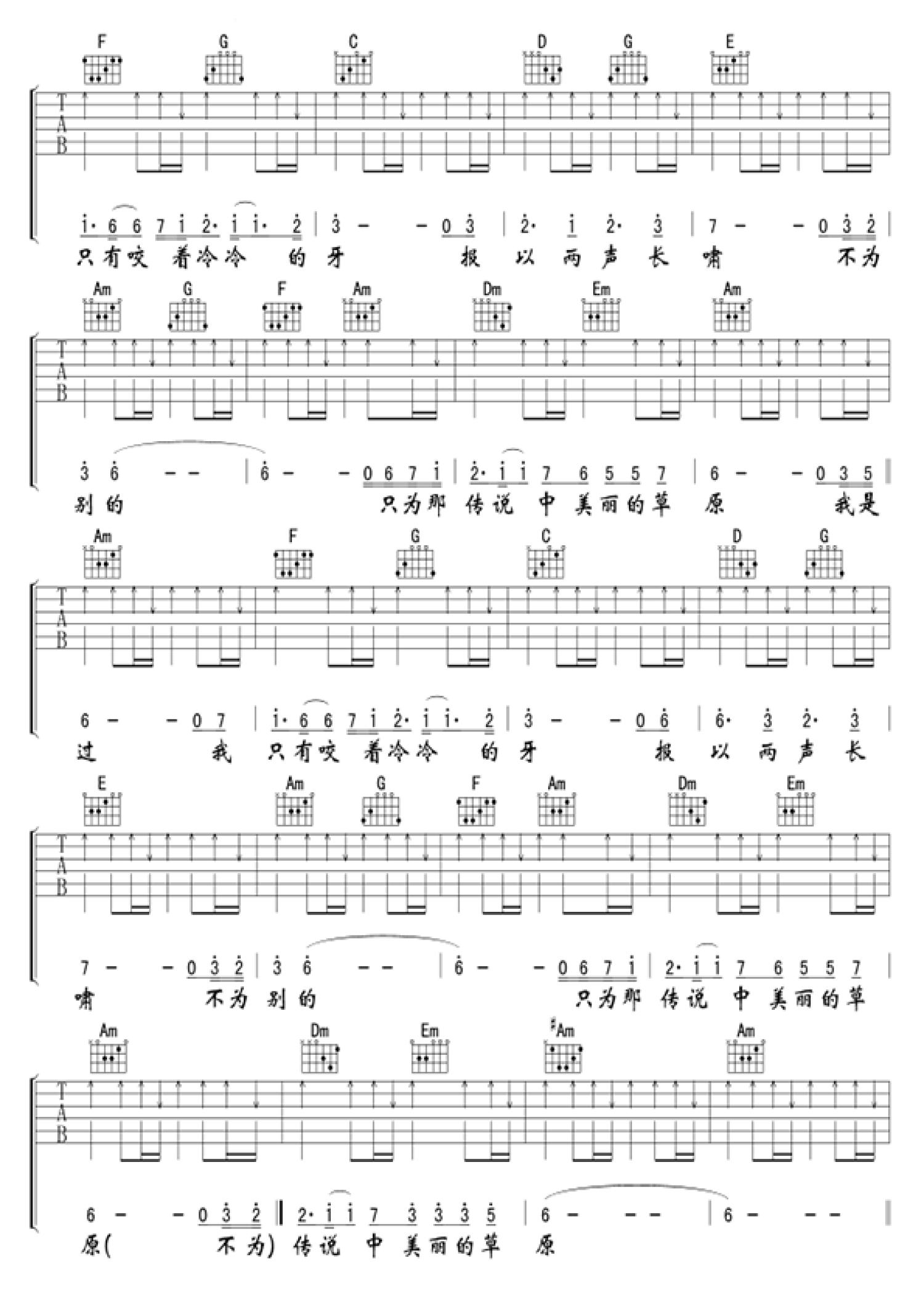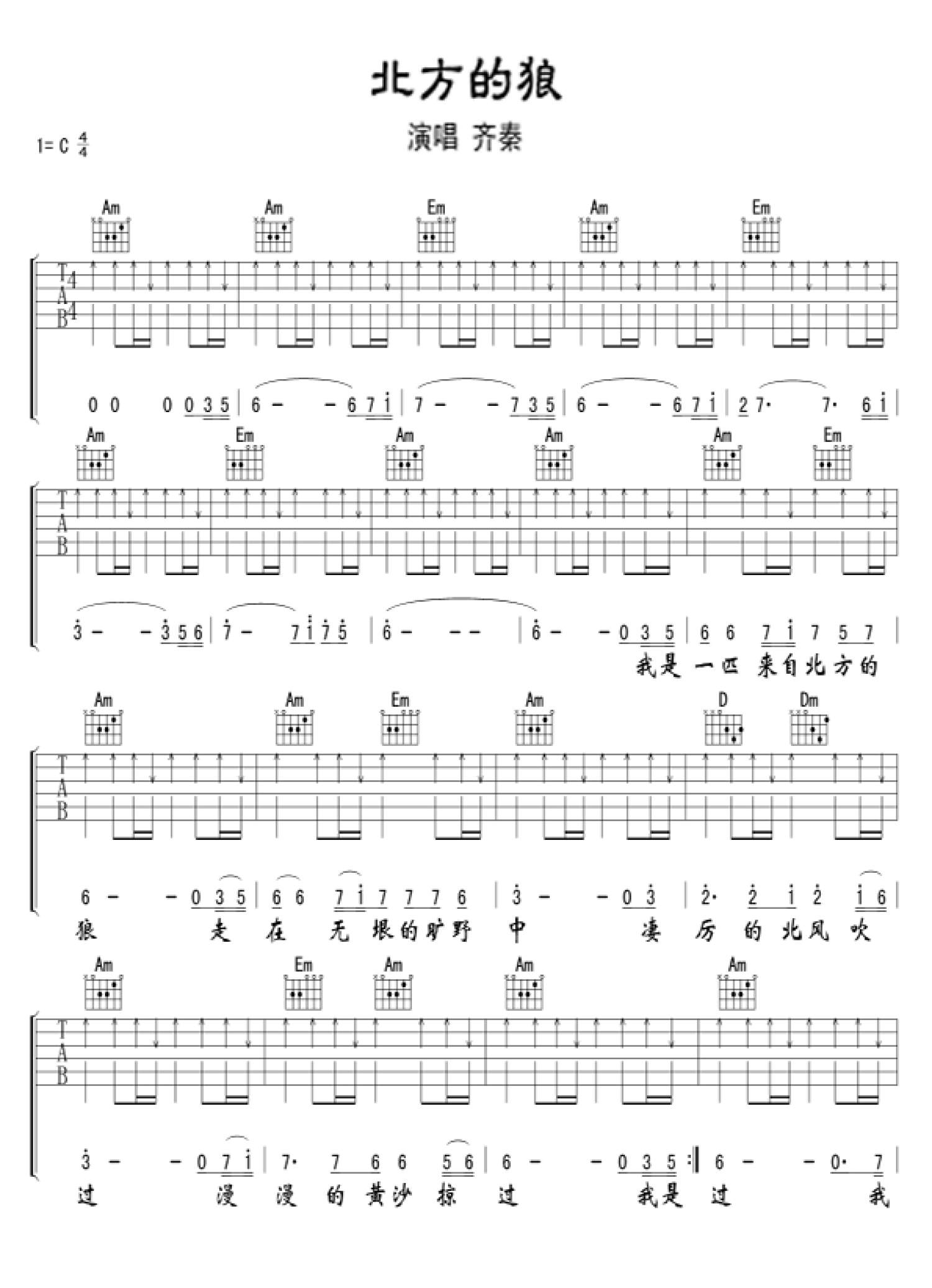曲谱介绍: 齐秦《北方的狼》吉他谱_C调吉他弹唱谱