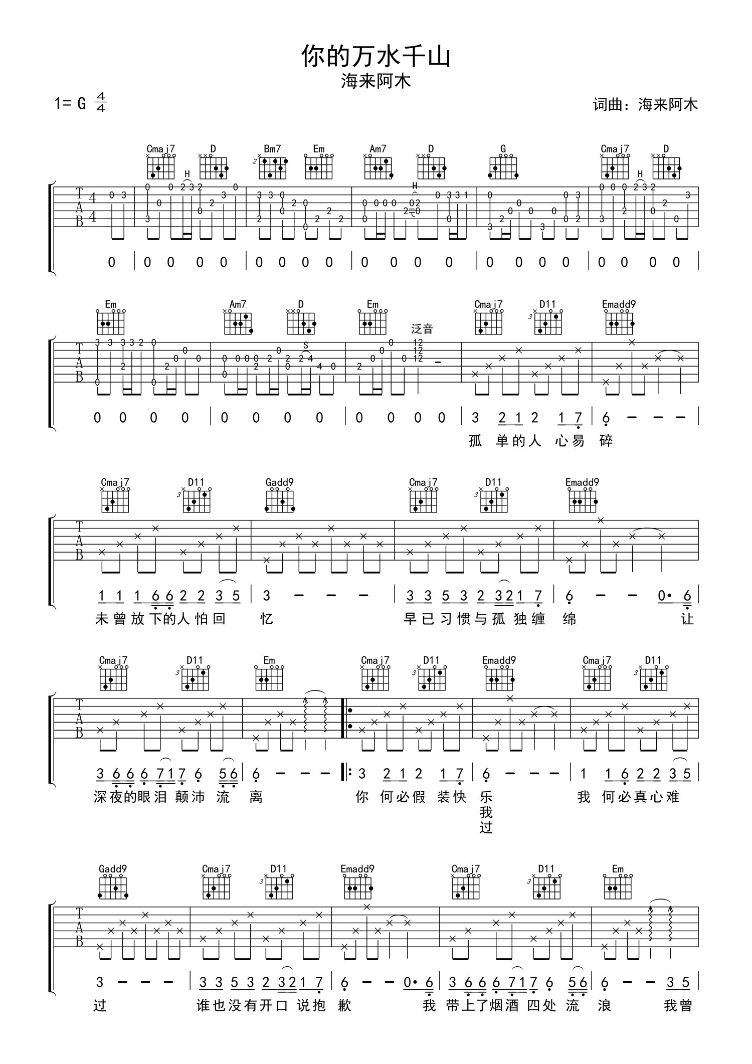 曲谱介绍: 海来阿木《你的万水千山》吉他谱_G调吉他弹唱谱