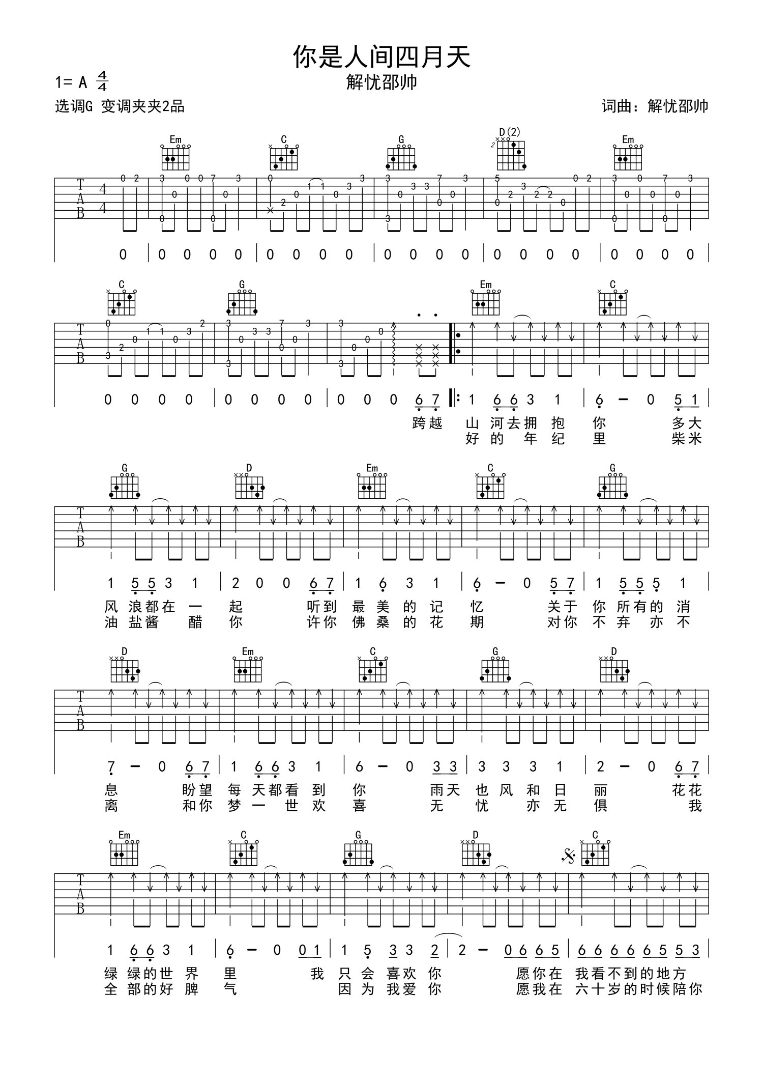 曲谱介绍: 解忧邵帅《你是人间四月天》吉他谱_G调吉他弹唱谱