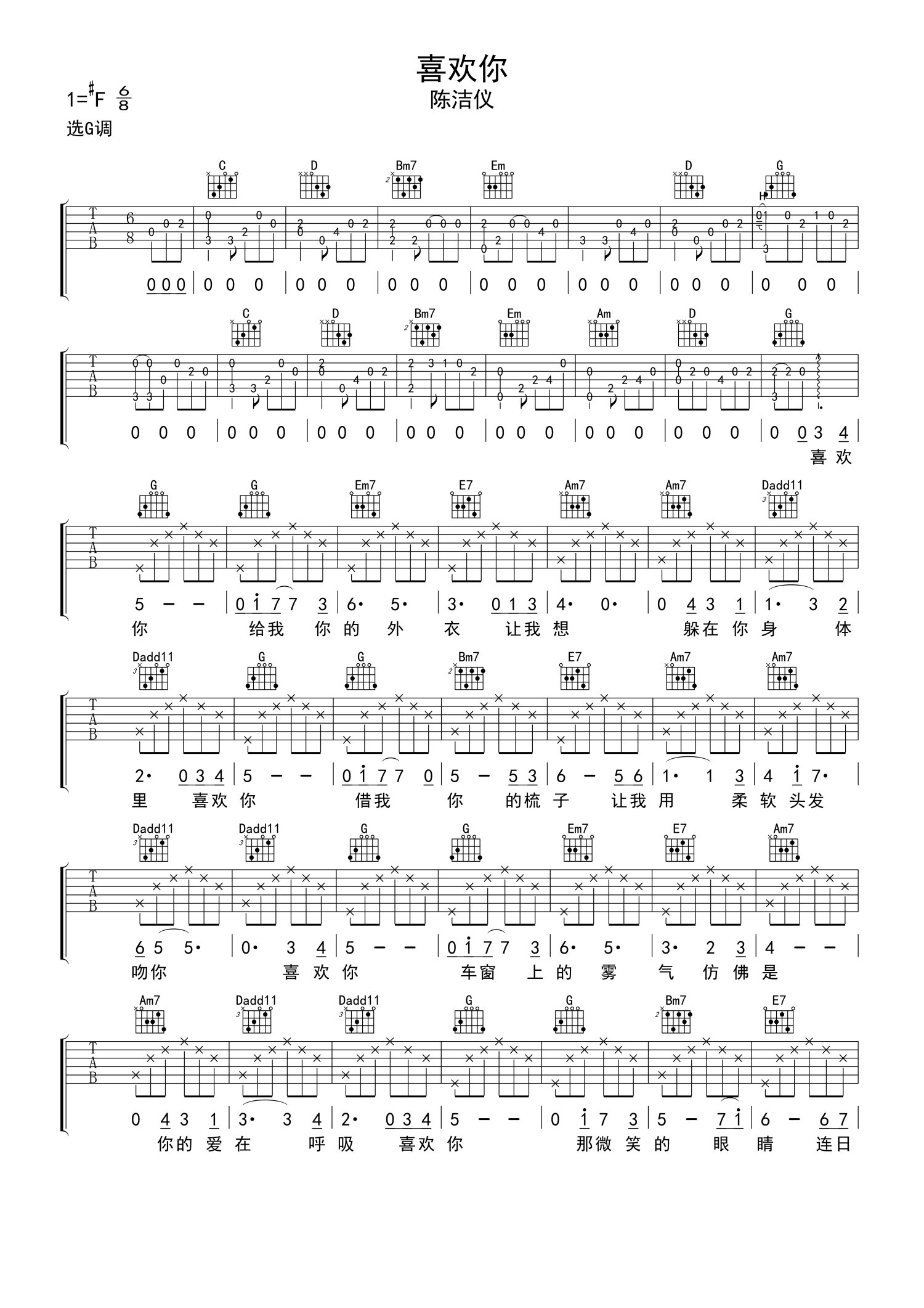 曲谱介绍: 陈洁仪《喜欢你》吉他谱_G调吉他弹唱谱