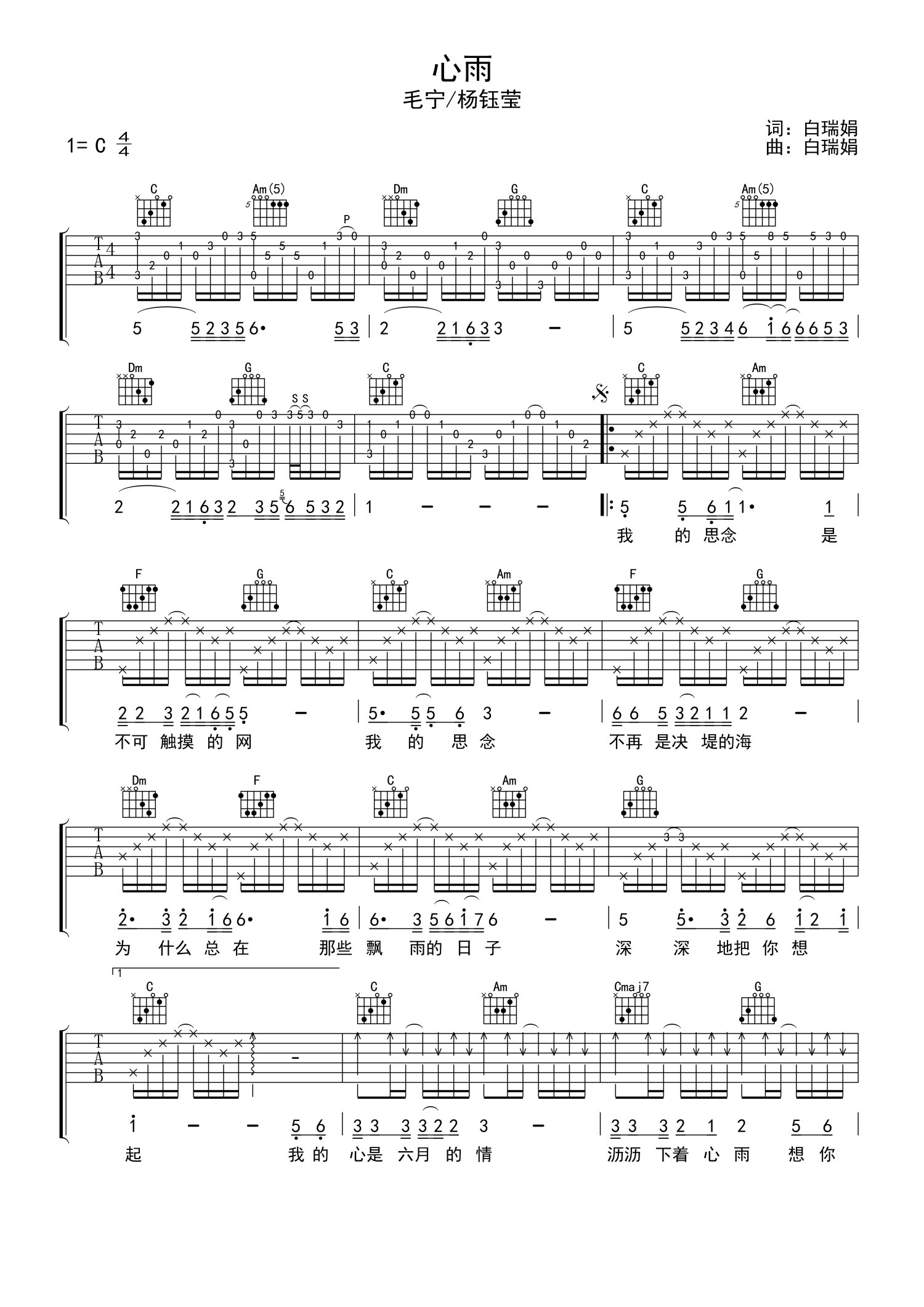 曲谱介绍: 毛宁/杨钰莹《心雨》吉他谱_C调吉他弹唱谱