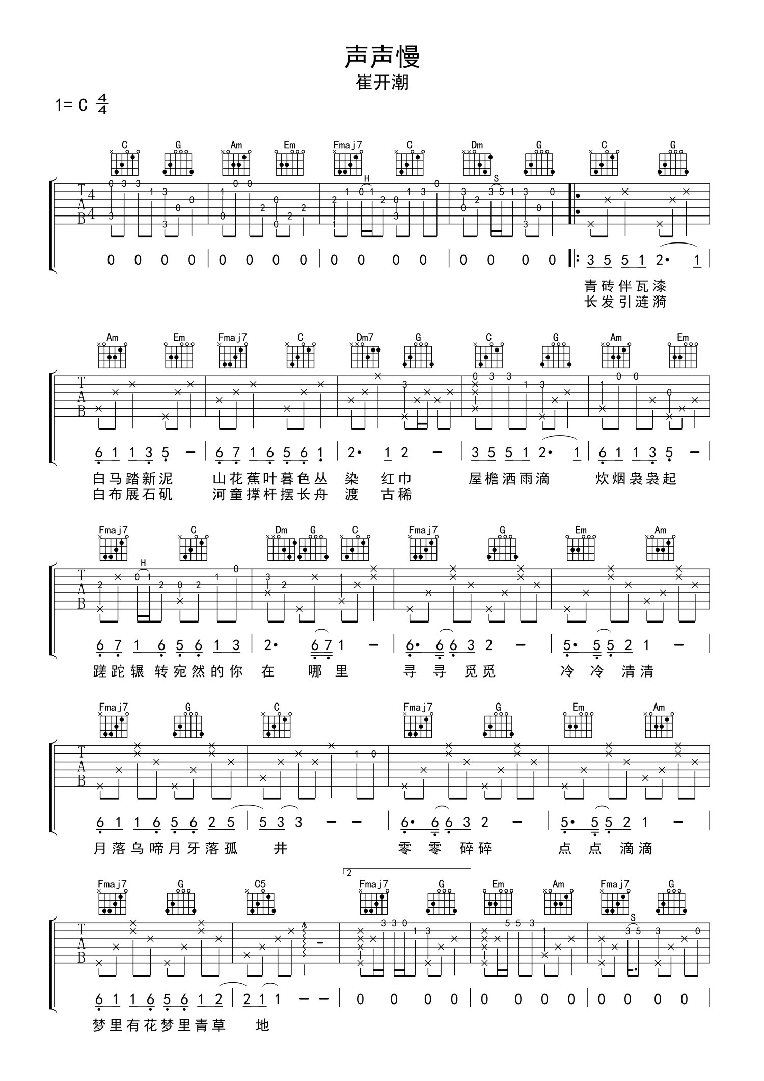 曲谱介绍: 崔开潮《声声慢》吉他谱_C调吉他弹唱谱