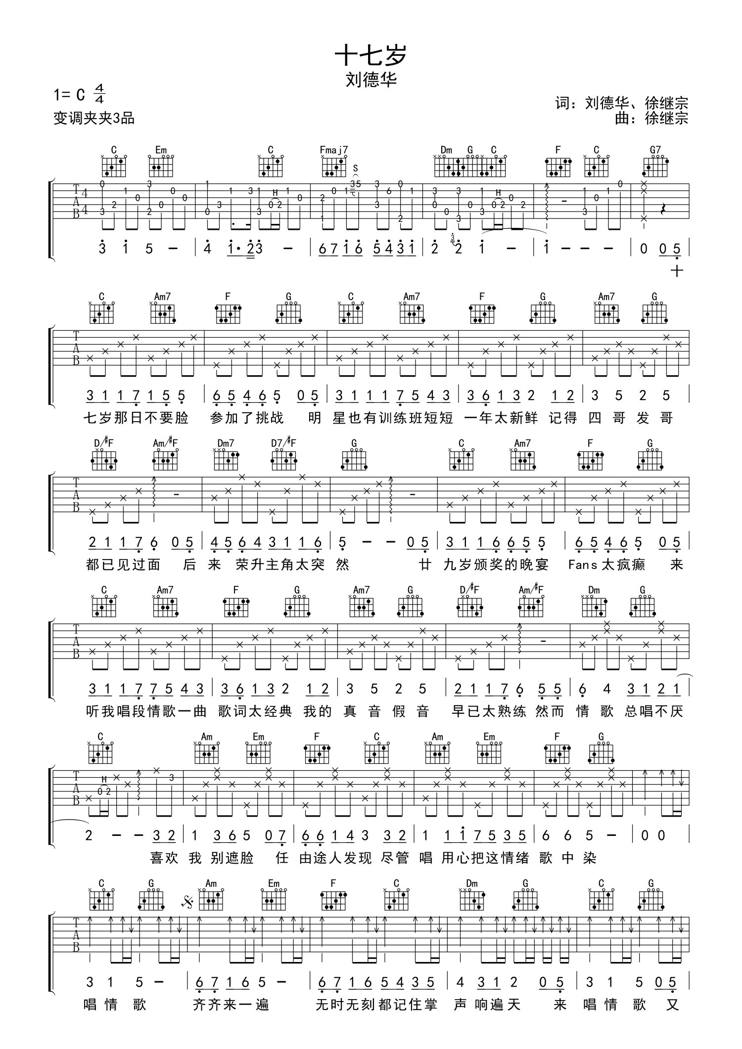 曲谱介绍: 刘德华《十七岁》吉他谱_C调吉他弹唱谱
