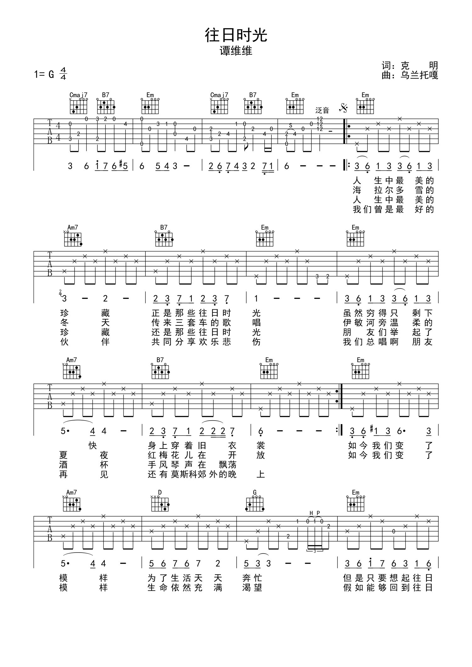 曲谱介绍: 谭维维《往日时光》吉他谱_G调吉他弹唱谱