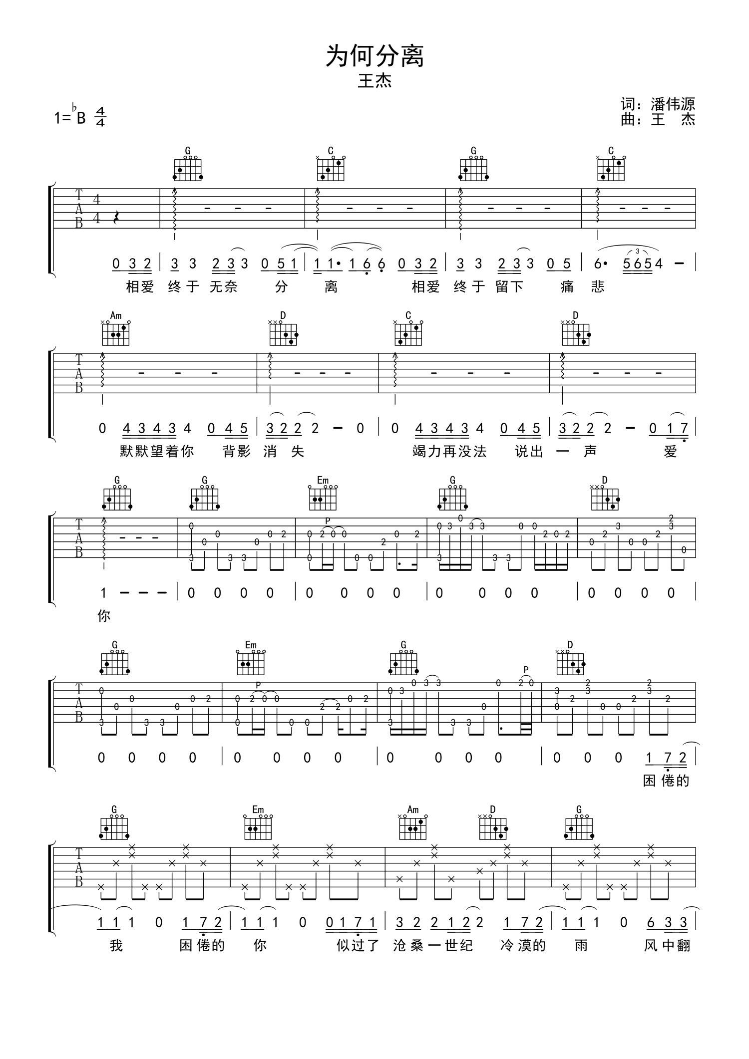 曲谱介绍: 王杰《为何分离》吉他谱_G调吉他弹唱谱