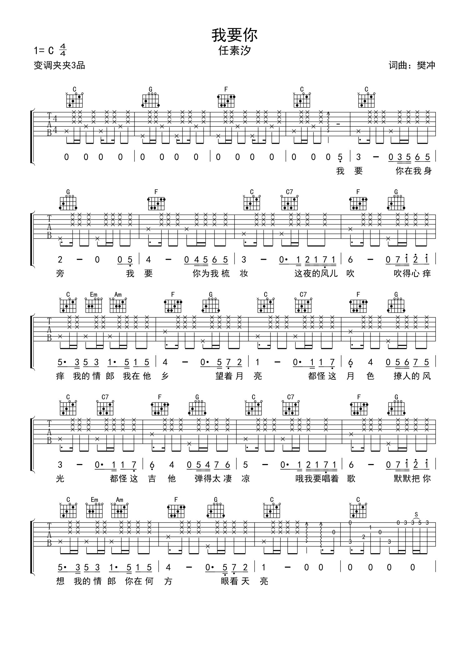 曲谱介绍: 任素汐《我要你》吉他谱_C调吉他弹唱谱