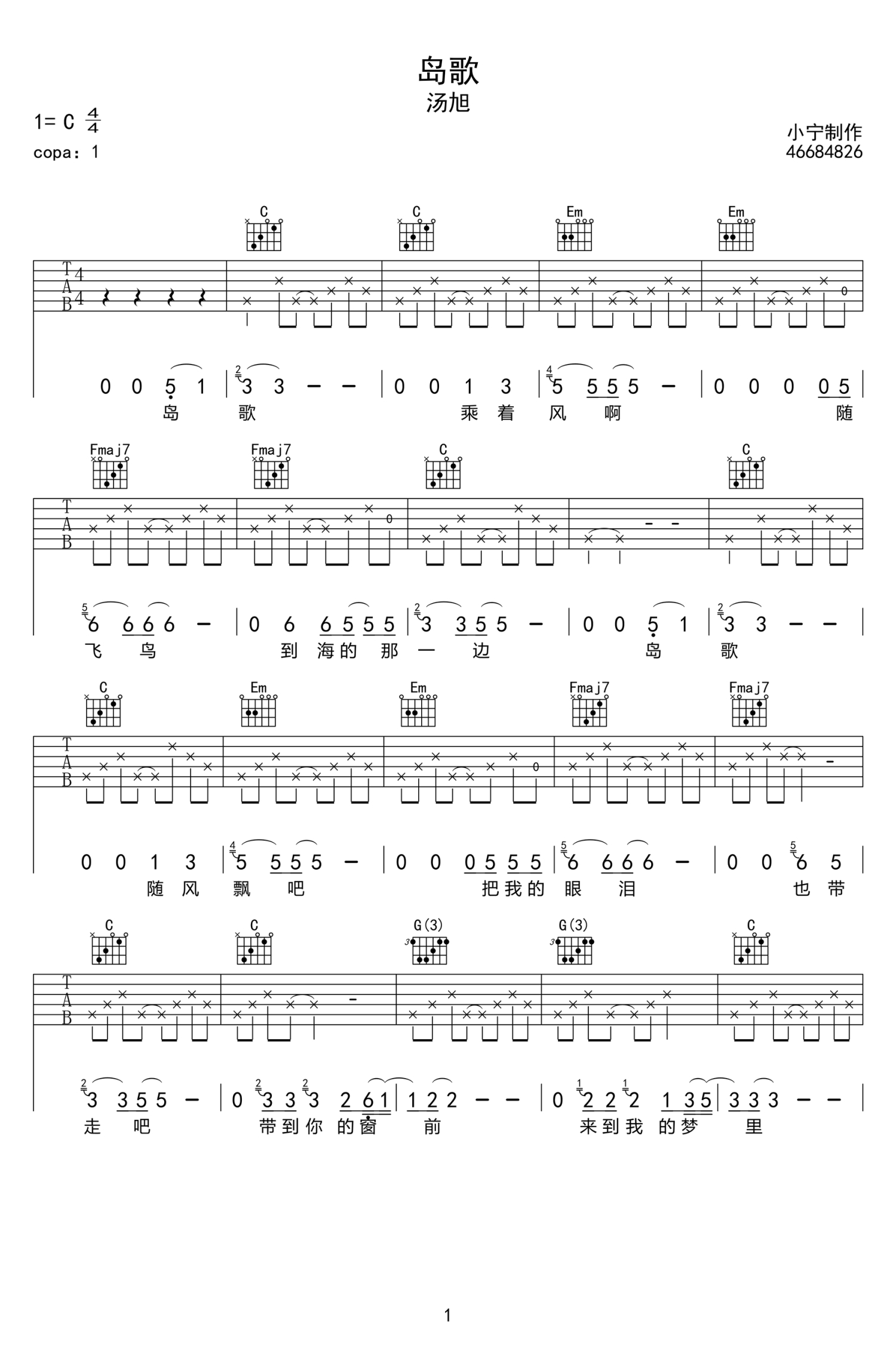 岛歌吉他谱 - 汤旭 - C调吉他弹唱谱