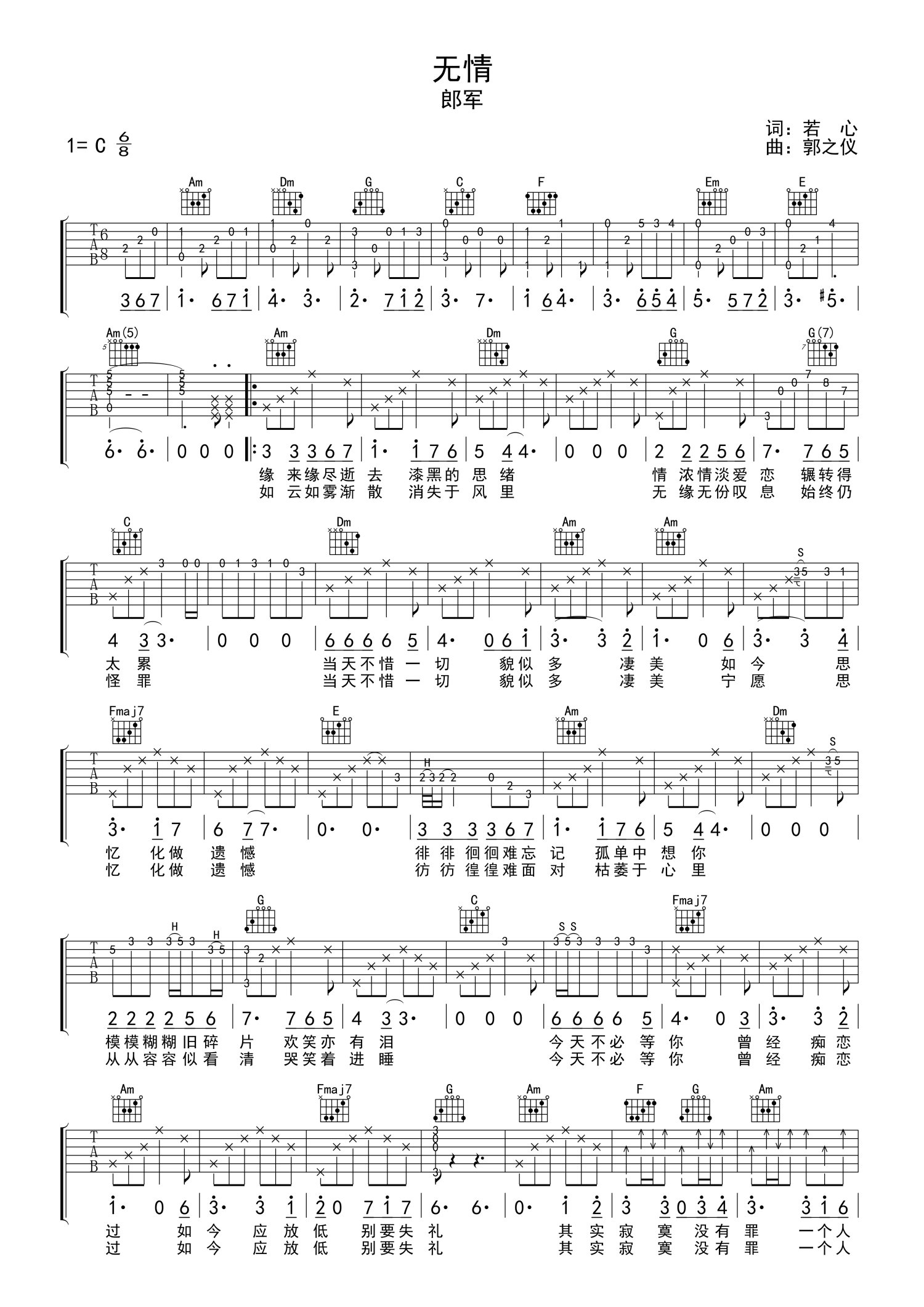 曲谱介绍: 郎军《无情》吉他谱_C调吉他弹唱谱
