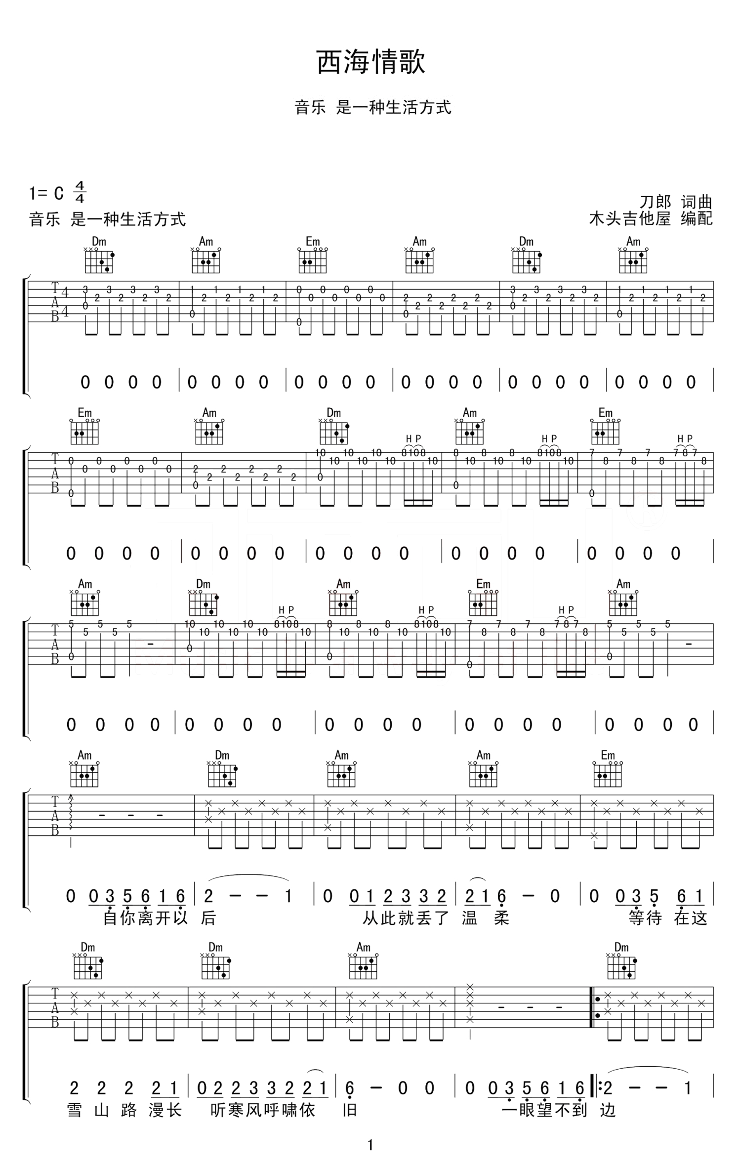 西海情歌吉他谱 - 刀郎 - C调吉他弹唱谱 - 高度还原版