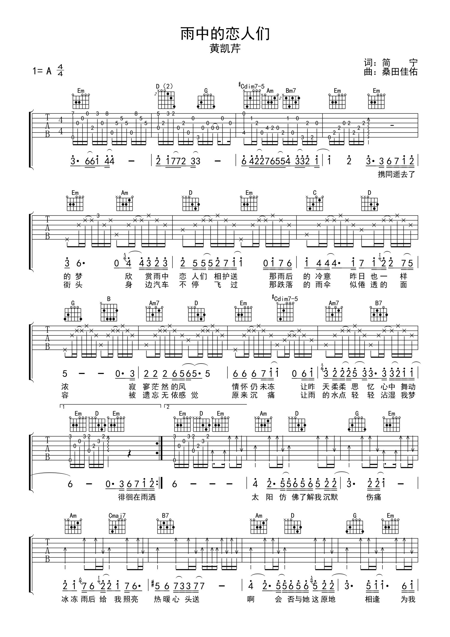 曲谱介绍: 黄凯芹《雨中的恋人们》吉他谱_G调吉他弹唱谱