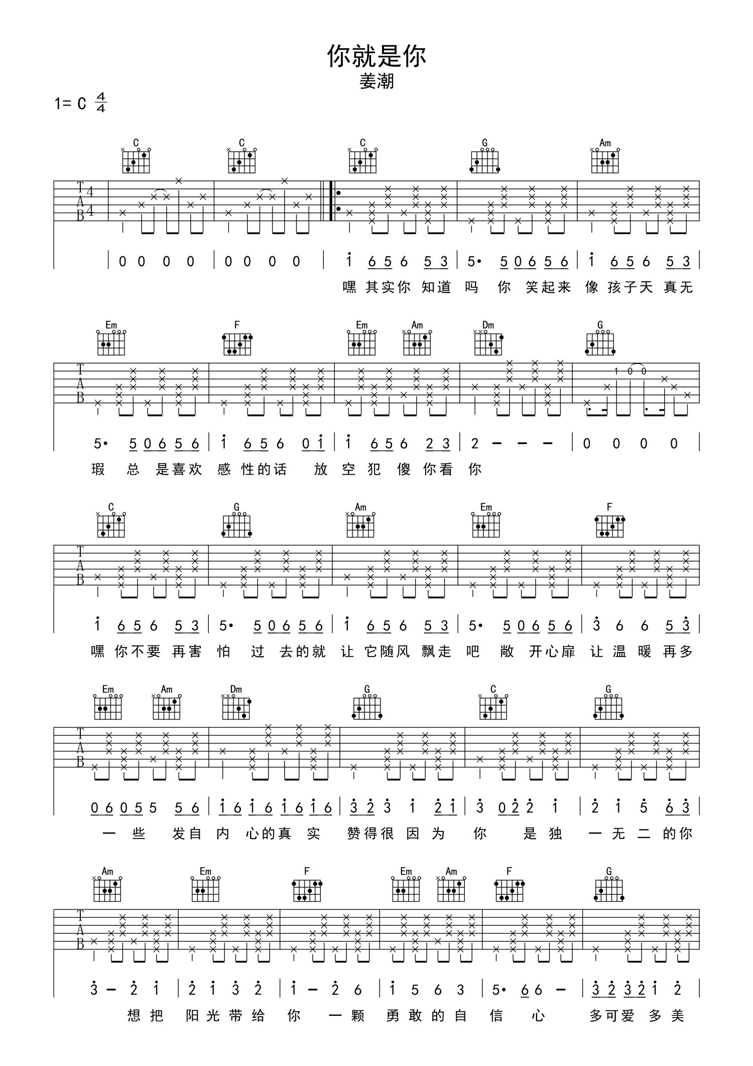 曲谱介绍: 姜潮《你就是你》吉他谱_C调吉他弹唱谱