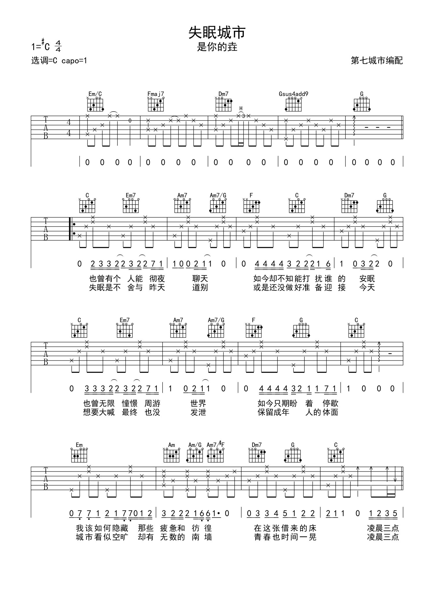 • 失眠城市吉他谱 - 是你的垚 - C调吉他弹唱谱第1张
