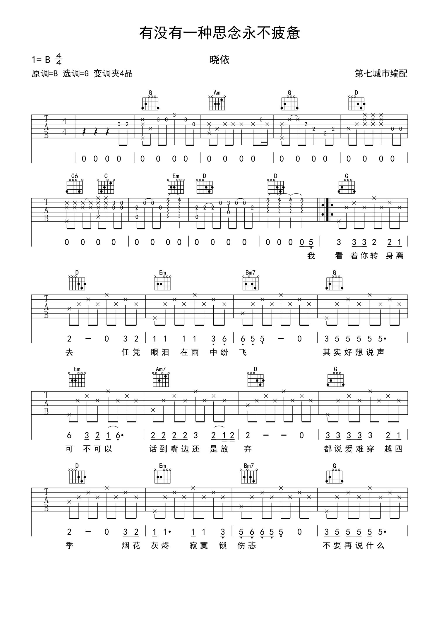 曲谱介绍: 晓依《有没有一种思念永不疲惫》吉他谱_G调吉他弹唱谱