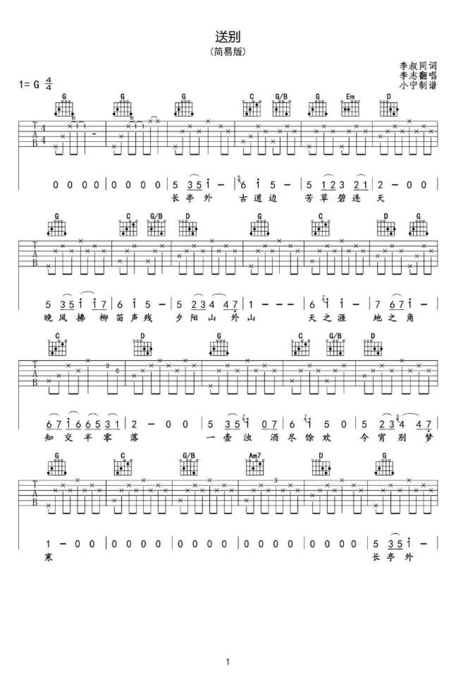 曲谱介绍: 李志《送别》吉他谱,G调指法编配,写离别最好的歌非这首莫属,众多歌手一次次翻唱,更证明其经典动人。长亭外,古道边,芳草碧连天,一首歌曲,既可以用作送别一个人,也可以送走一段过往。李志的《送别》娓娓唱来,情绪表达得不满不溢,在时光的流转中,连B哥都变得柔软起来。