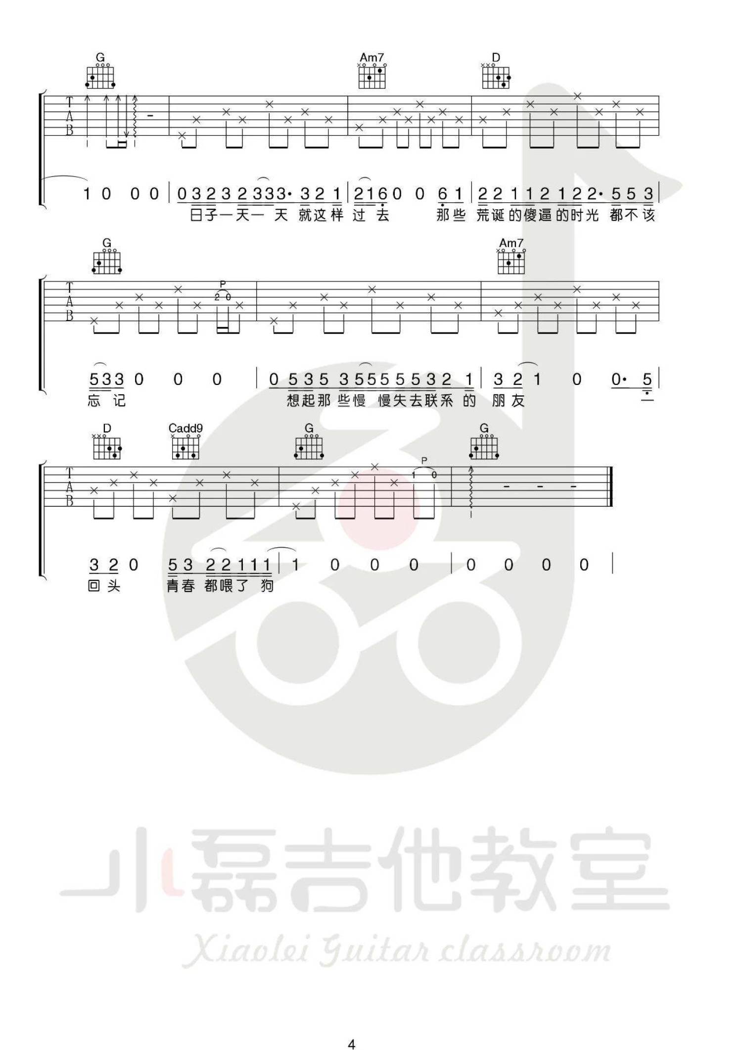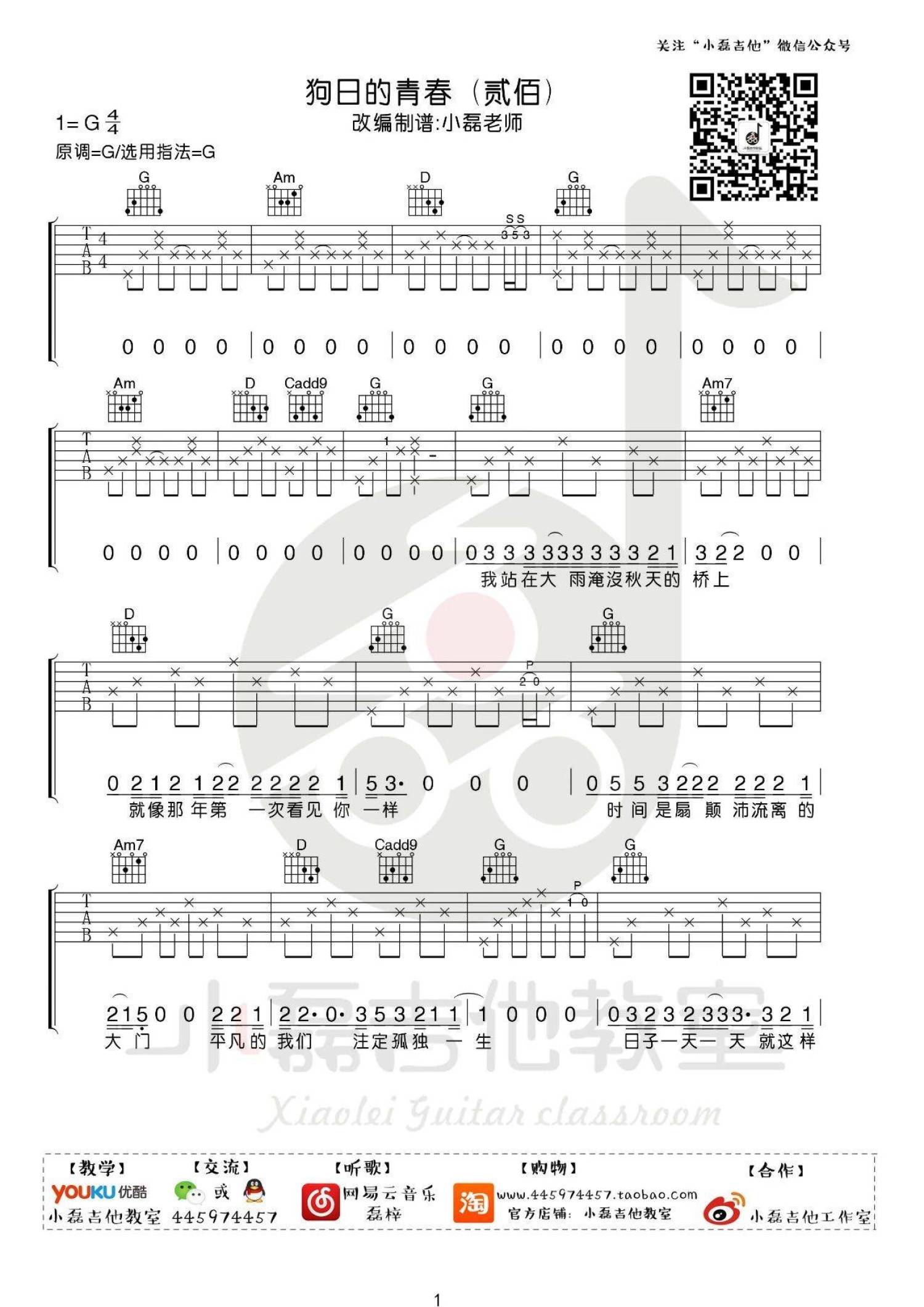 曲谱介绍: 贰佰《狗日的青春》,那些迷惘青春里的美好和无常生命里的感动,锈迹斑斑却刻骨铭心。青春里会无期的忧伤,那些曾经的踟蹰与迷茫,你的青春喂狗了吗?狗日的青春吉他弹唱视频教程来自小磊吉他编配《狗日的青春》吉他谱,附弹唱视频演示教程。这首歌的整体设置的难度不高,初学者通过练习应该可以完全掌握,前奏部分老师用到了小小的滑音技巧来呈现,整体上扫弦居多,所以大家要把练习重点放在扫弦节奏和力度的把握上!