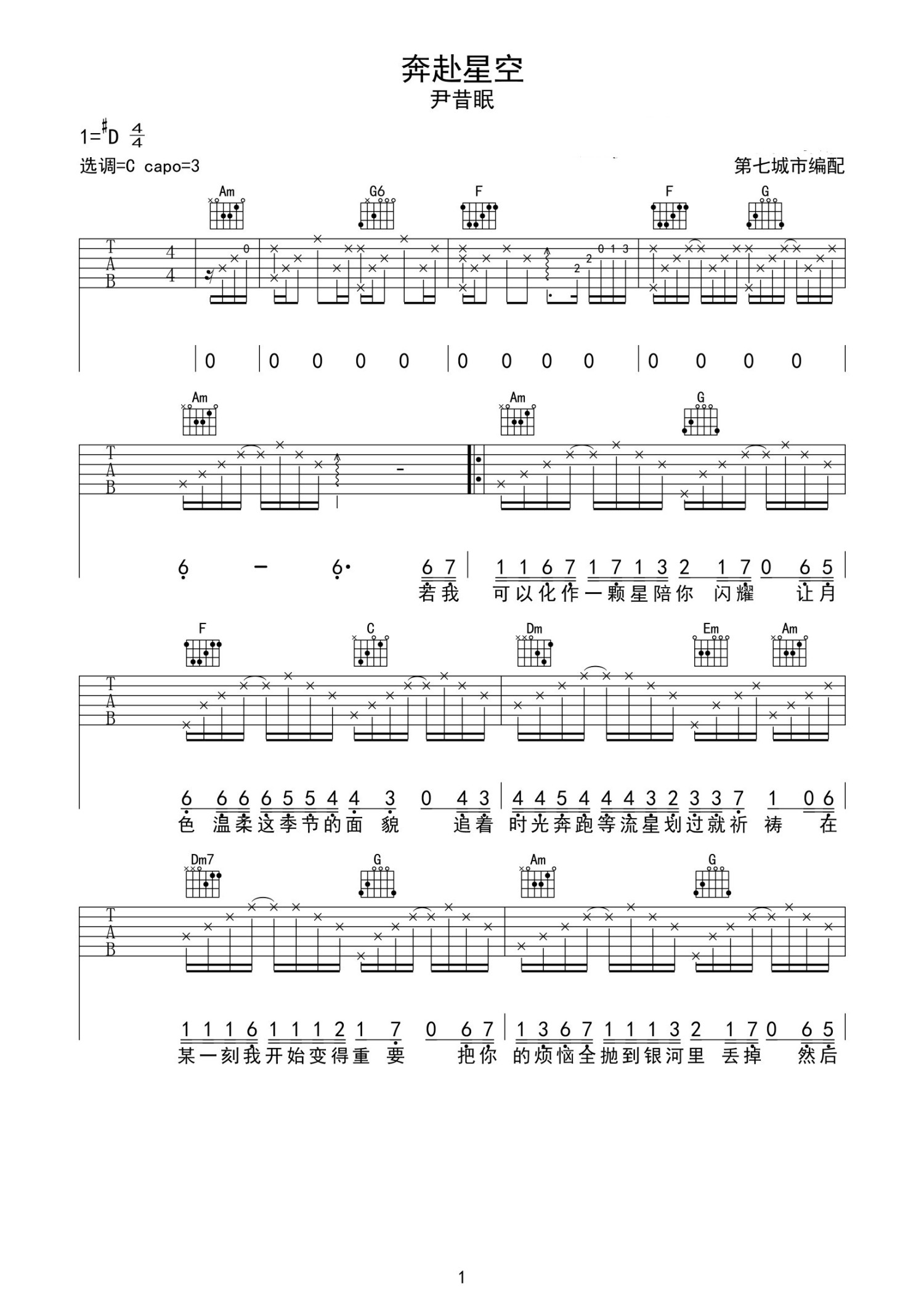 • 奔赴星空吉他谱 - 尹昔眠 - C调吉他弹唱谱第1张