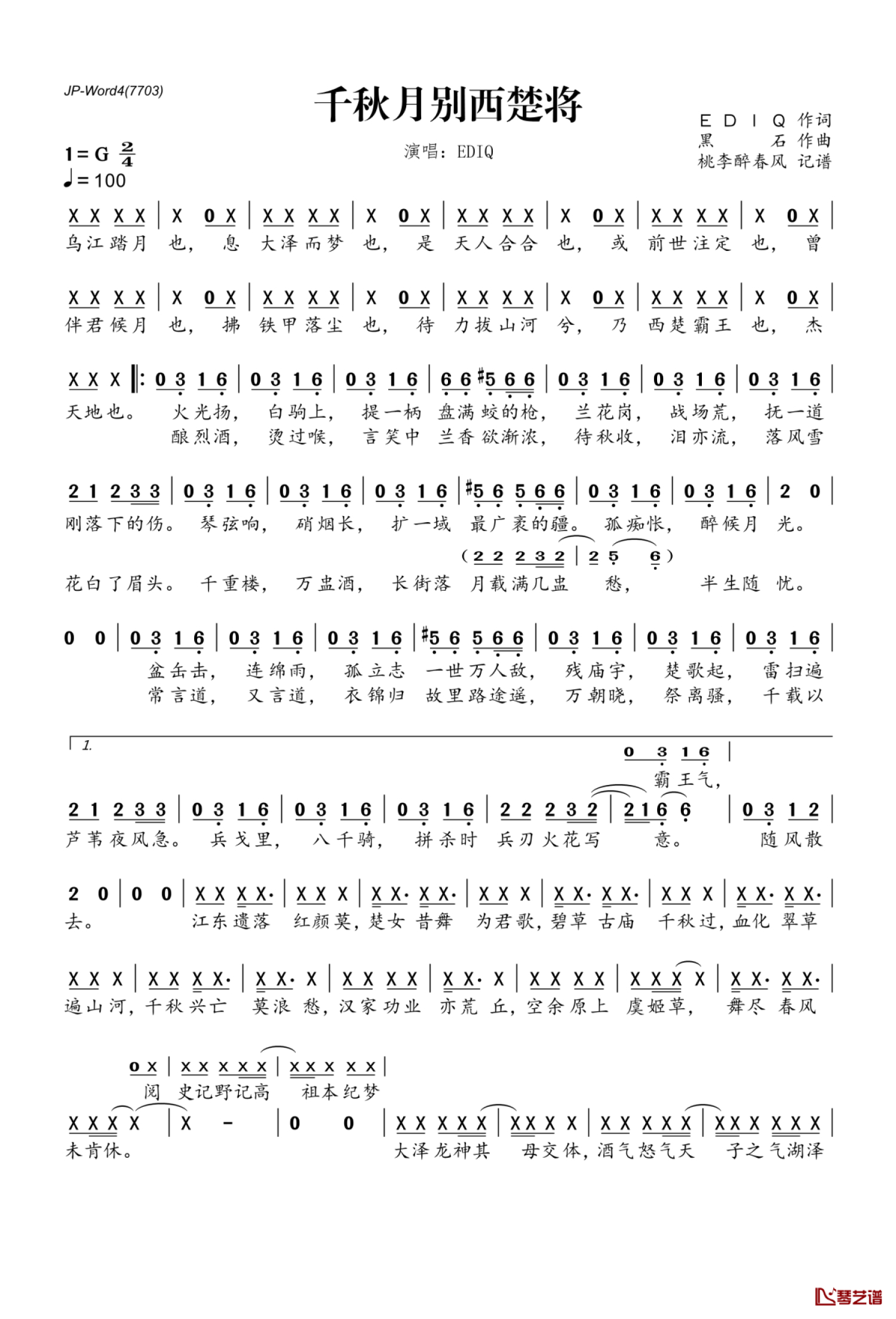 曲谱介绍: ediq《千秋月别西楚将》歌词_简谱