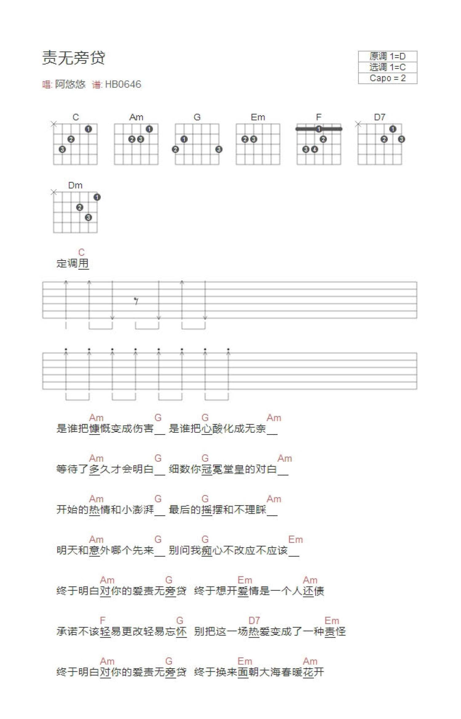 责无旁贷吉他谱 - 阿悠悠 - C调吉他弹唱谱 - 和弦谱