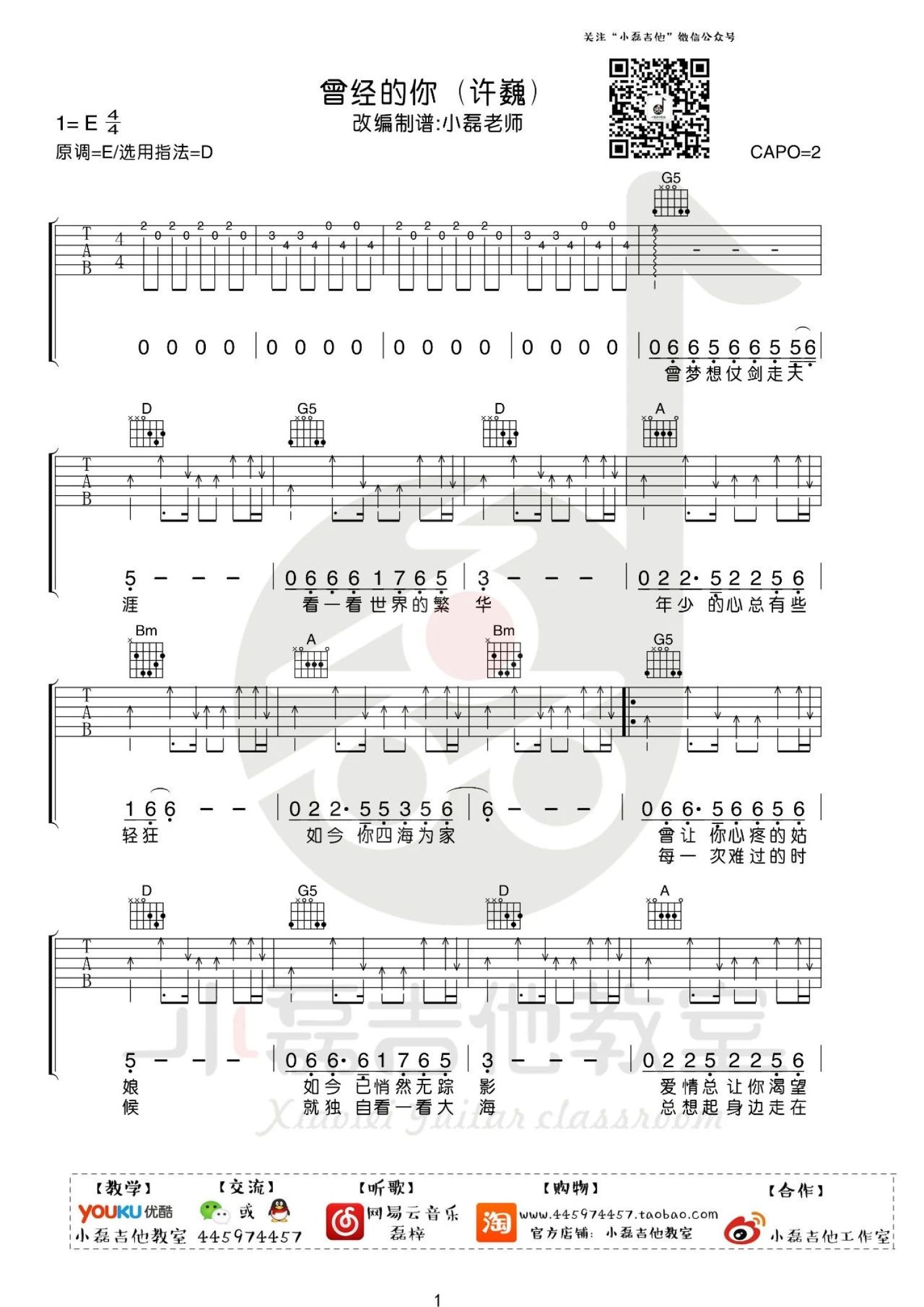 曲谱介绍: 许巍怀旧金曲《曾经的你》,前奏一响就能让人热泪盈眶。这里是来自小磊老师编配《曾经的你》的吉他谱,附弹唱视频教学。大部分学习吉他的朋友都会学过这首歌,歌曲的扫弦的伴奏型比较容易让大家找到感觉,老师编配的这个版本在扫弦细节上做了些改动,让大家学起来更加有意义。《曾经的你》吉他弹唱视频教程-小磊吉他