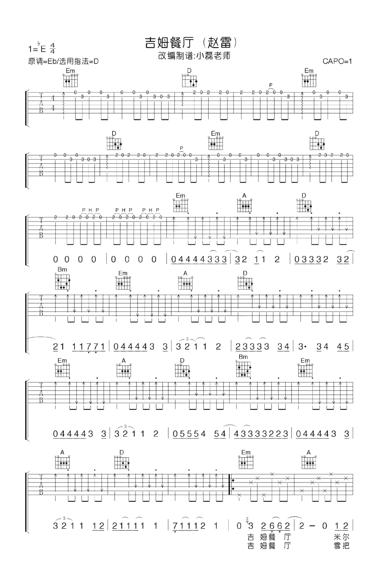 曲谱介绍: 赵雷《吉姆餐厅》吉他谱,原调Eb,选用D调指法,Capo夹一品,随谱附上配套吉他弹唱教学,一把吉他编配,这首歌曲有扫弦和分解和弦的成分,体现乐曲旋律的前后反差,使得歌曲呈现更加丰富。前奏部分编配也接近原版。喜欢赵雷歌曲的琴友们跟随老师的讲解示范练习起来吧。《吉姆餐厅》吉他弹唱演示及教学视频