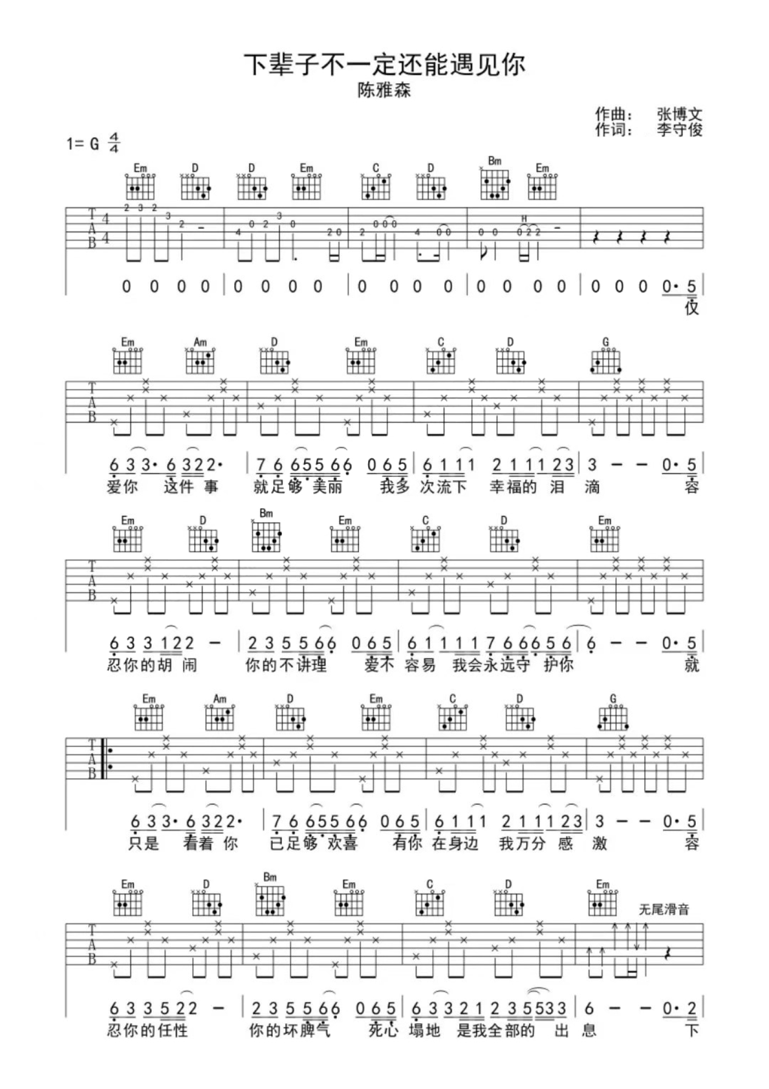 曲谱介绍: 陈雅森《下辈子不一定还能遇见你》吉他谱_G调吉他弹唱谱